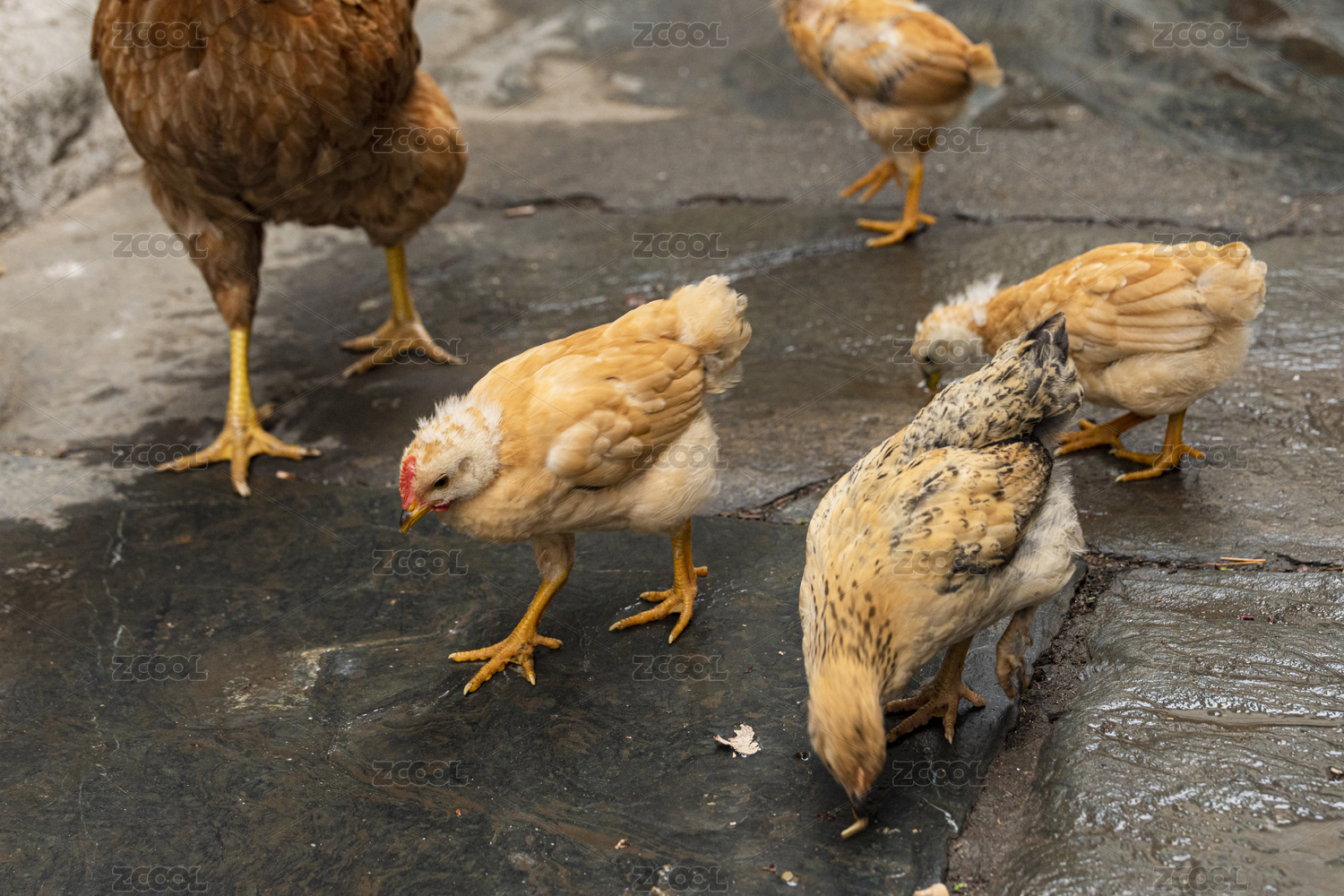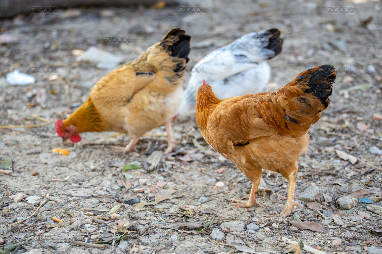 数只觅食的走地三黄鸡