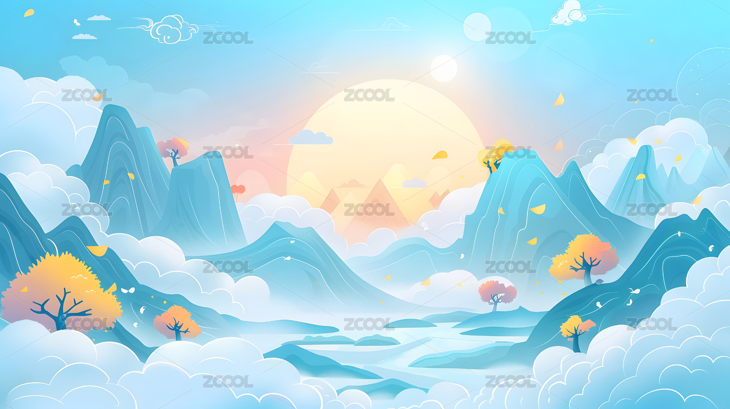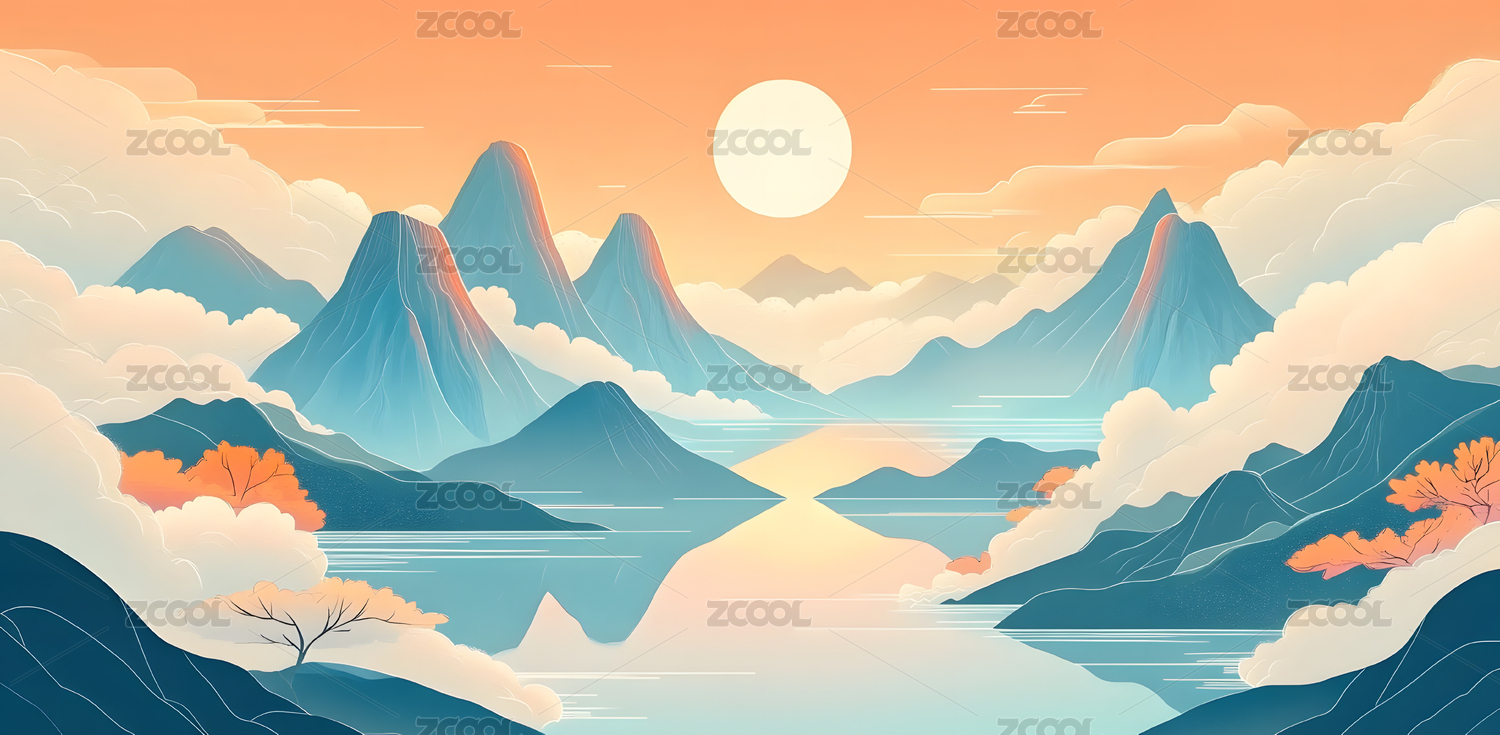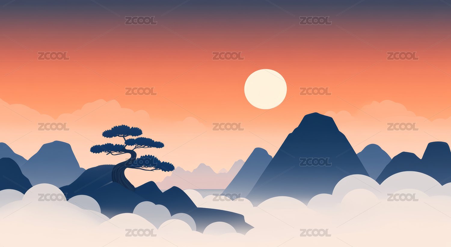 树,2D,平面,插画,插图,山,水,远山,群山,太阳