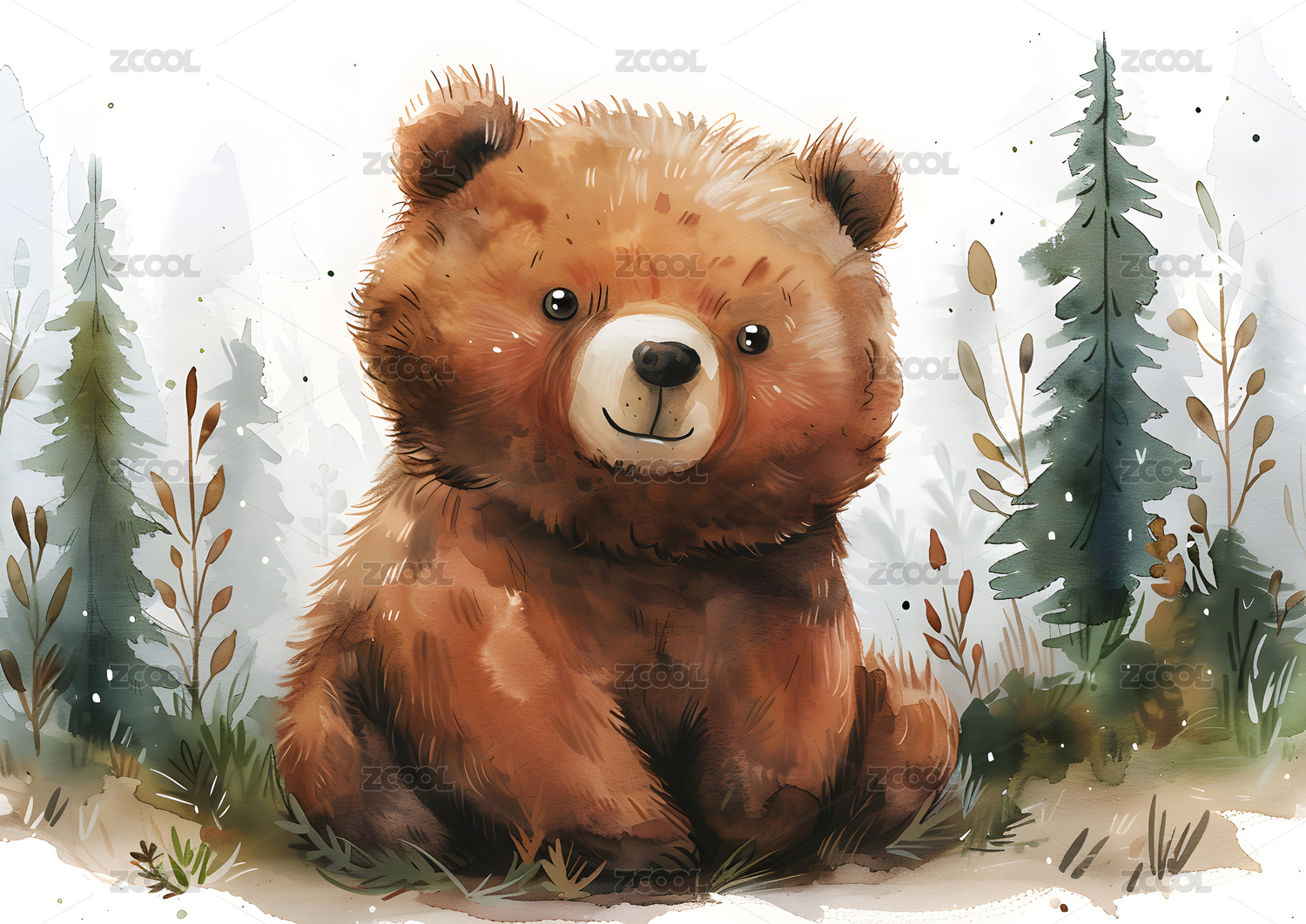 水彩插画森林里的小棕熊