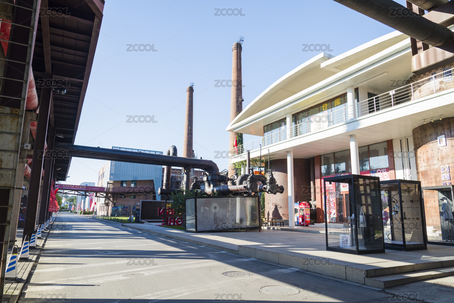 秋天早上的北京798艺术区广场工厂钢铁管道建筑