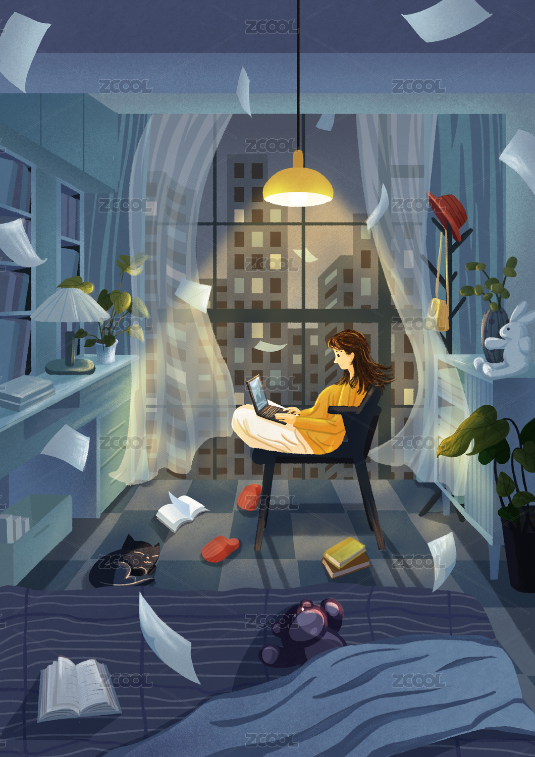 扁平风室内插画-夜晚