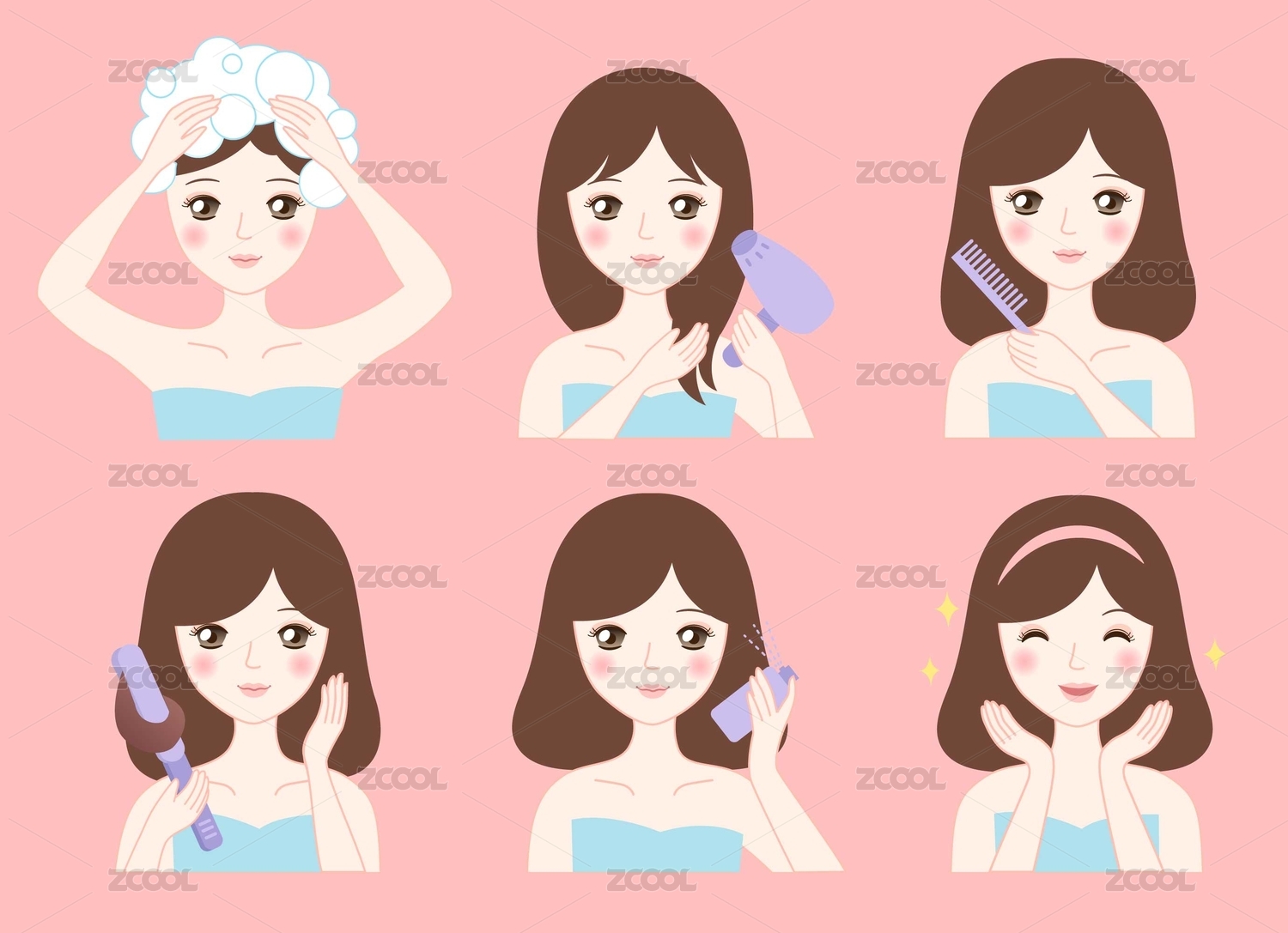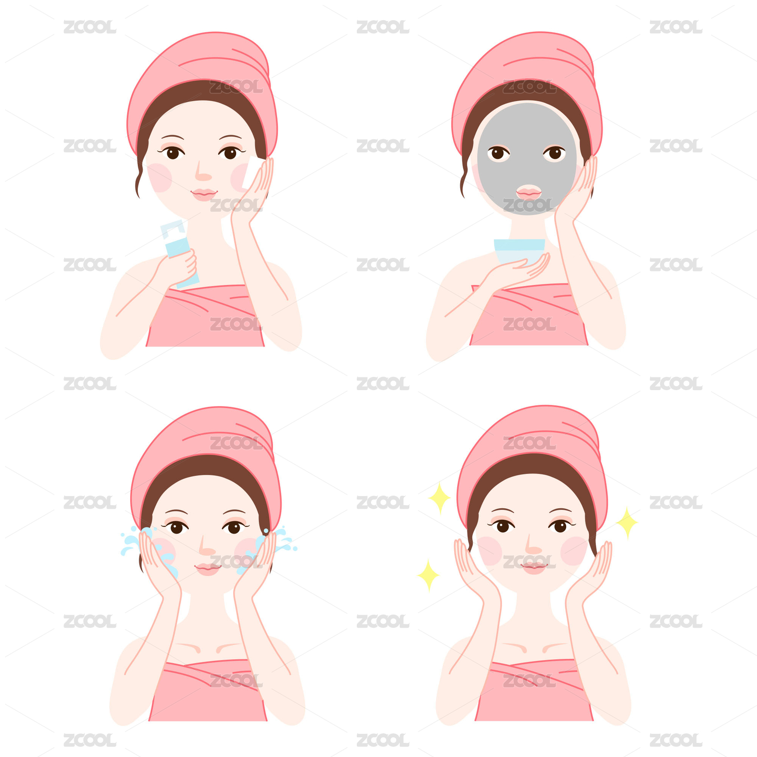 可爱女孩涂抹护肤品化妆品步骤矢量插图