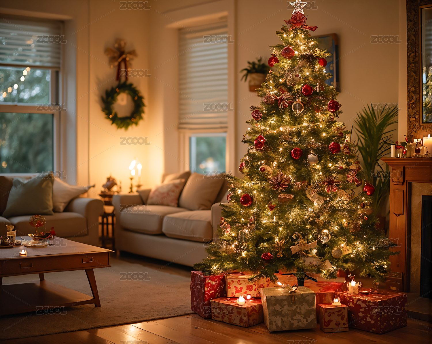 室内圣诞树和漂亮的圣诞礼物装饰圣诞节日