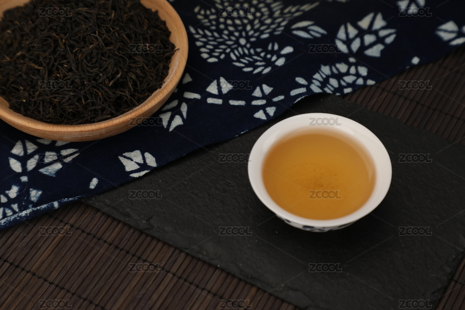 茶台上的茶叶与杯子中的茶水