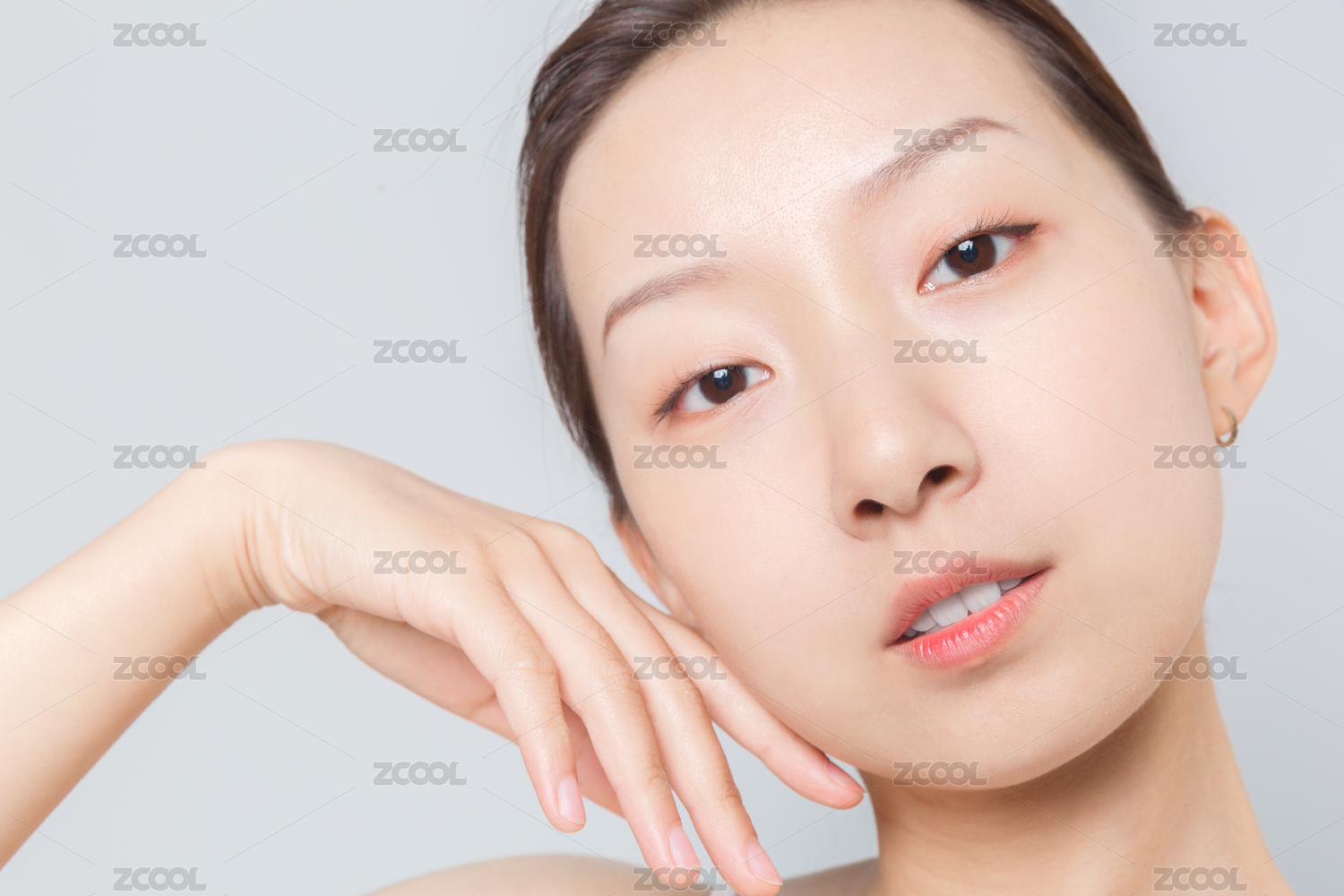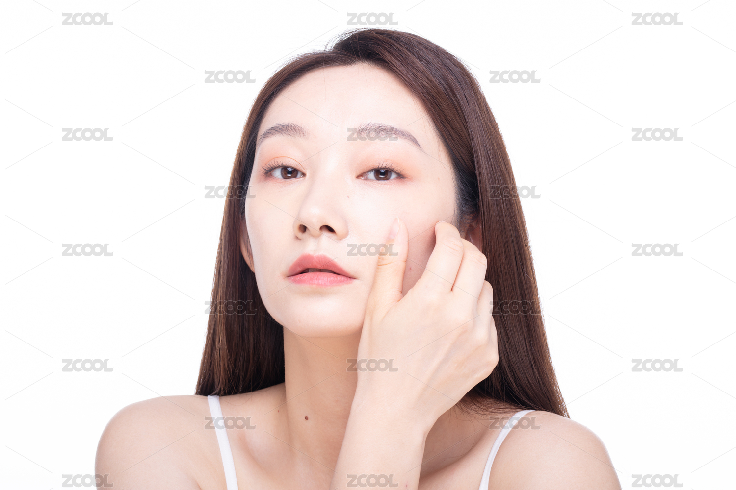 一位年轻的亚裔女性站在纯色背景前用手指轻抚脸颊