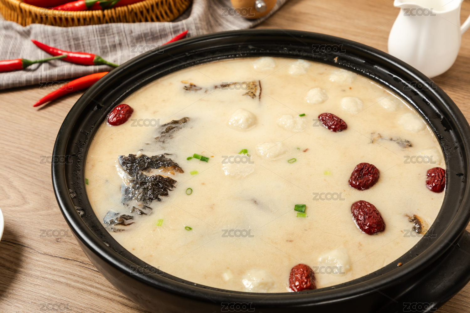 木桌面上黑色汤锅上装着一锅乌鸡汤特写