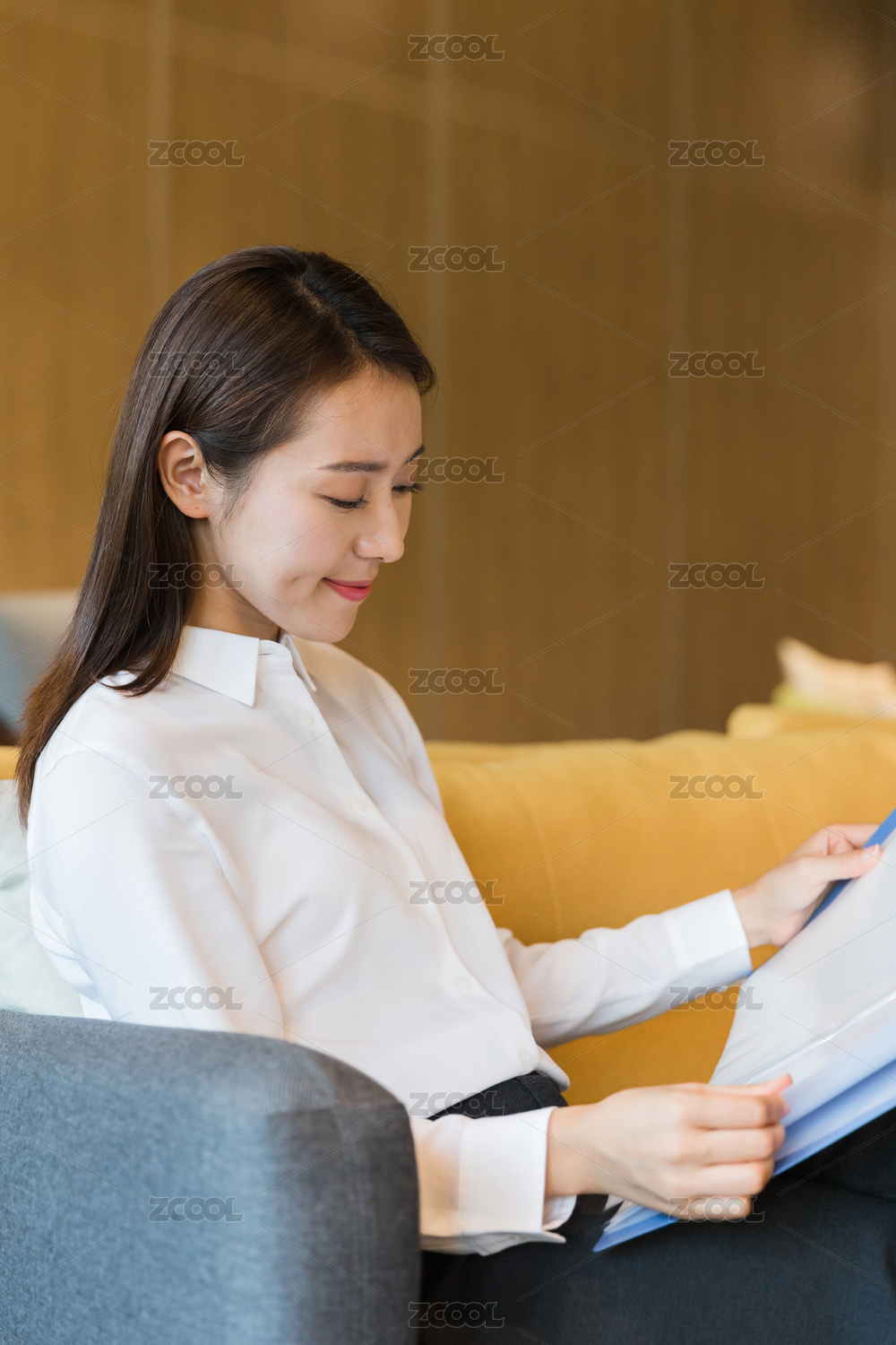 年轻职场女性坐在沙发上看文件