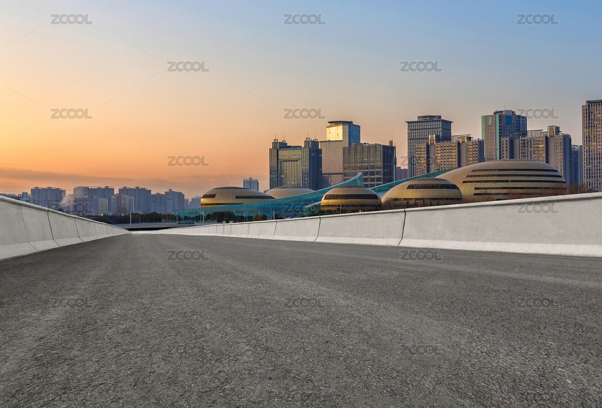 黄昏时分,前景为沥青道路的郑州城市景观和城市天际线