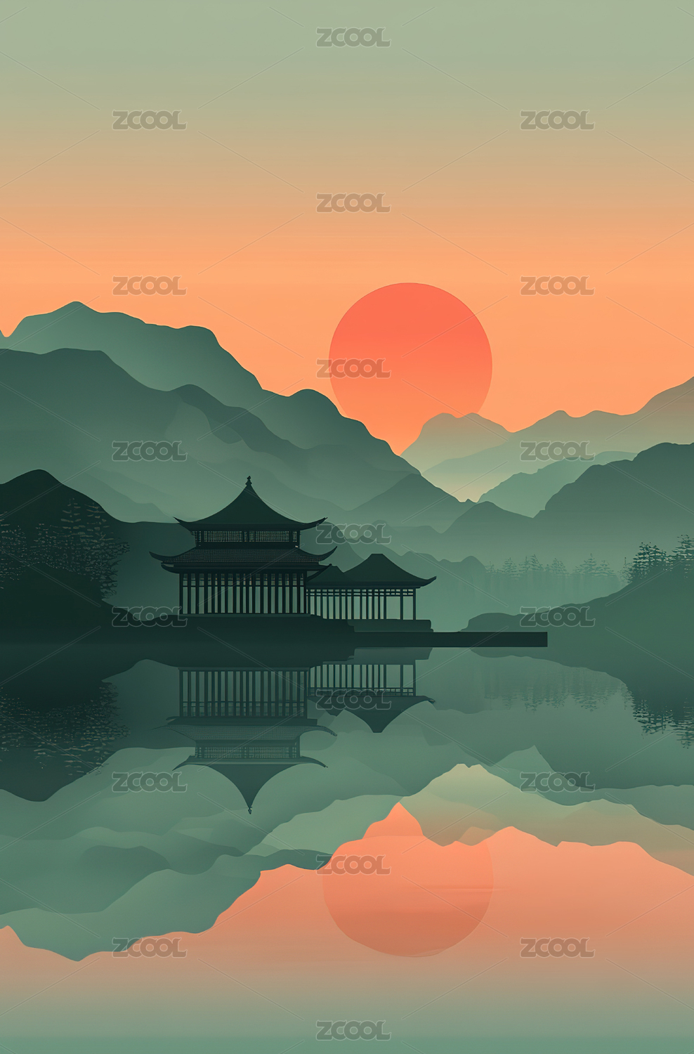 日落山峦下的亭台楼阁