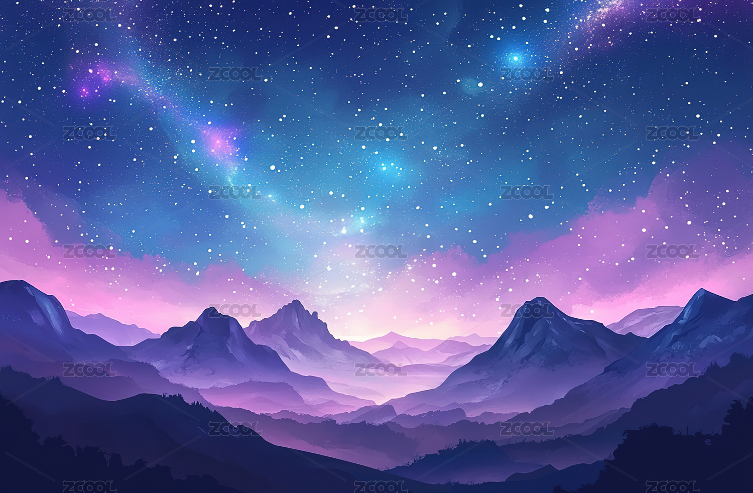 神秘夜空下的山脉与星河背景图