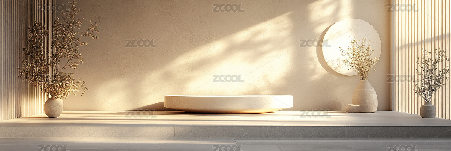 圆形装饰物,白色,圆柱形底座,半透明,圆形,物体,柔和,内部发光,浅色地面,淡黄色墙壁