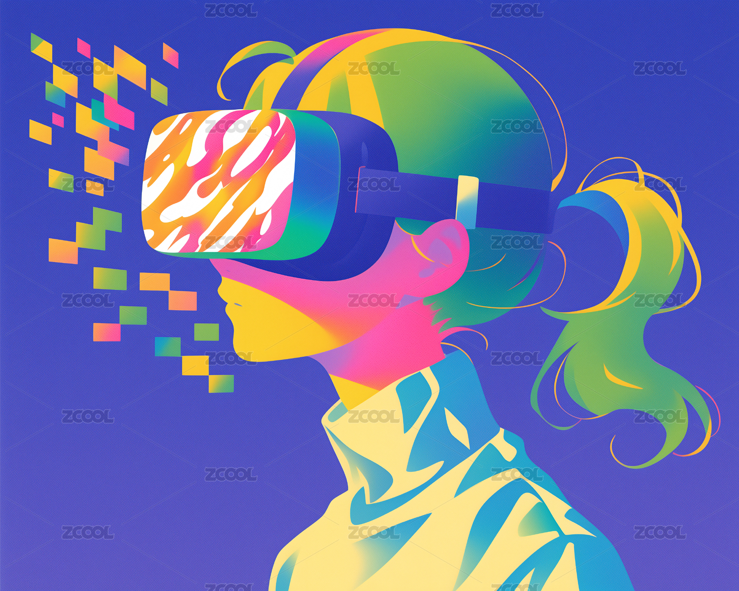 戴着VR眼镜女性炫彩方块潮流插画