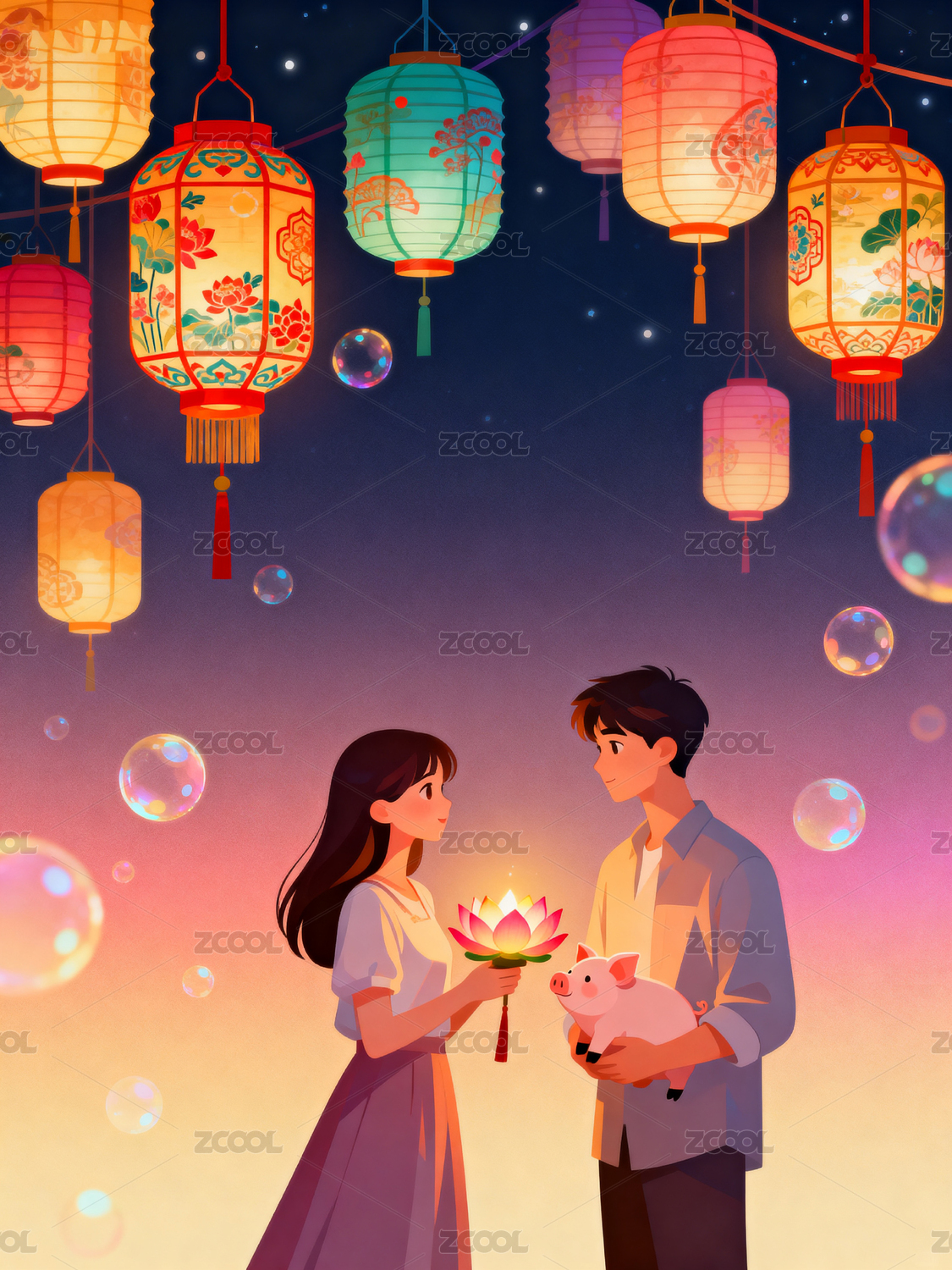 夜晚,圆月,月亮,灯笼,情侣,男女,情感,赏月,扁平,渐变