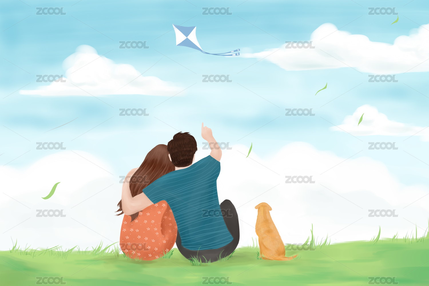 春天一对情侣带着狗狗坐在草地上看风筝唯美温馨插画