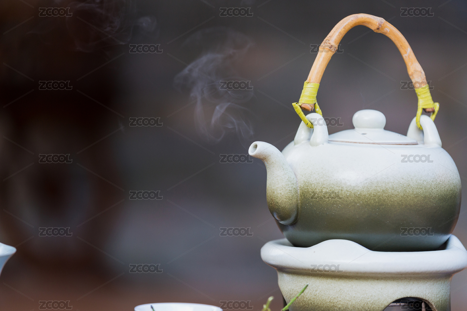 陶瓷茶具和袅袅飘散的沉香烟雾