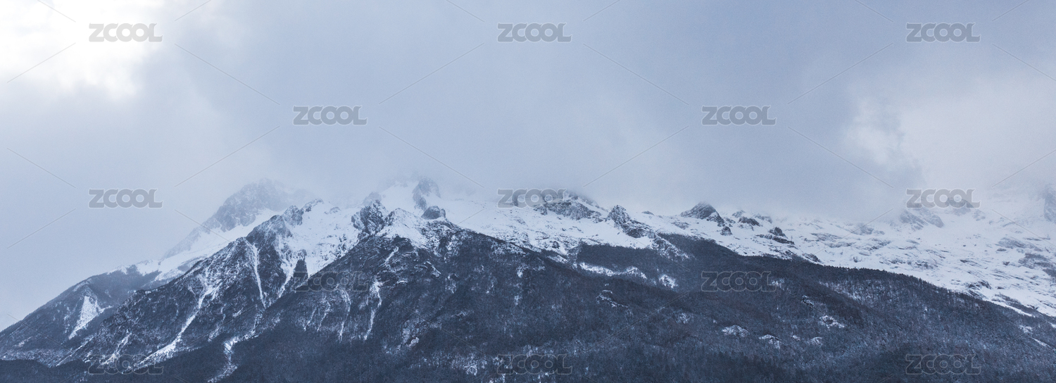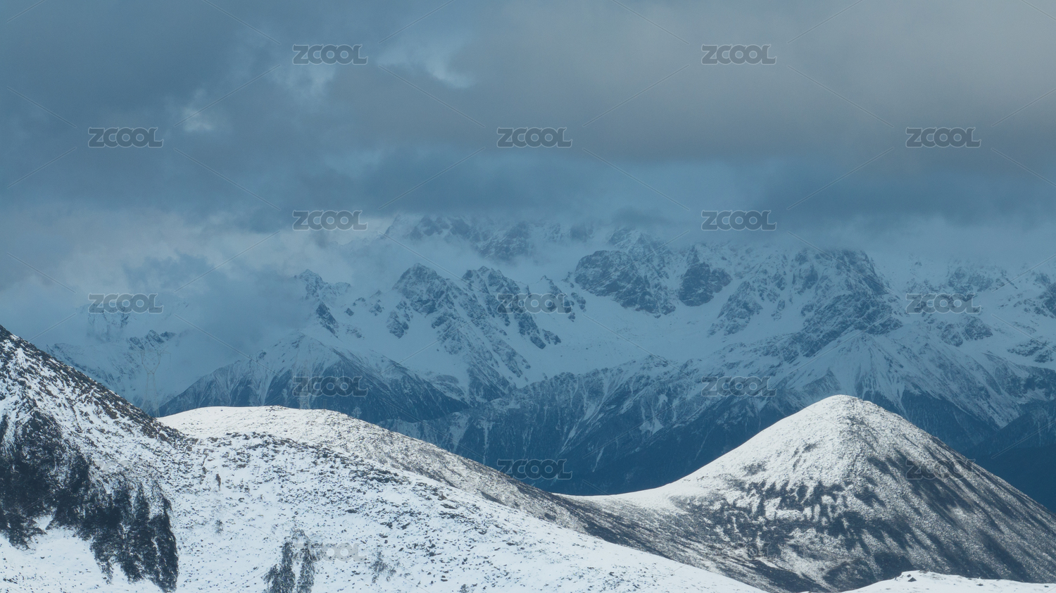 中国新疆夏特峡谷的雪峰上云雾弥漫