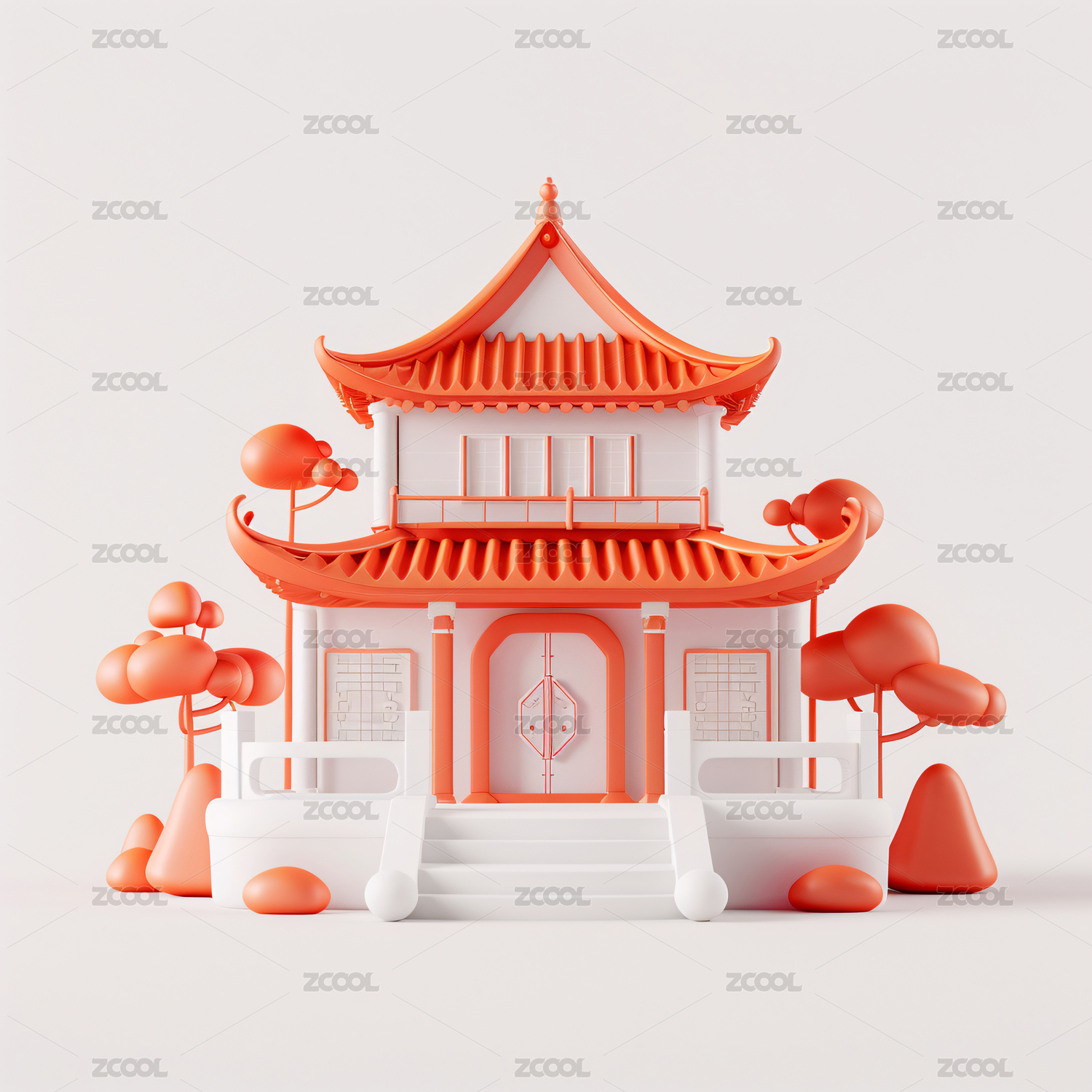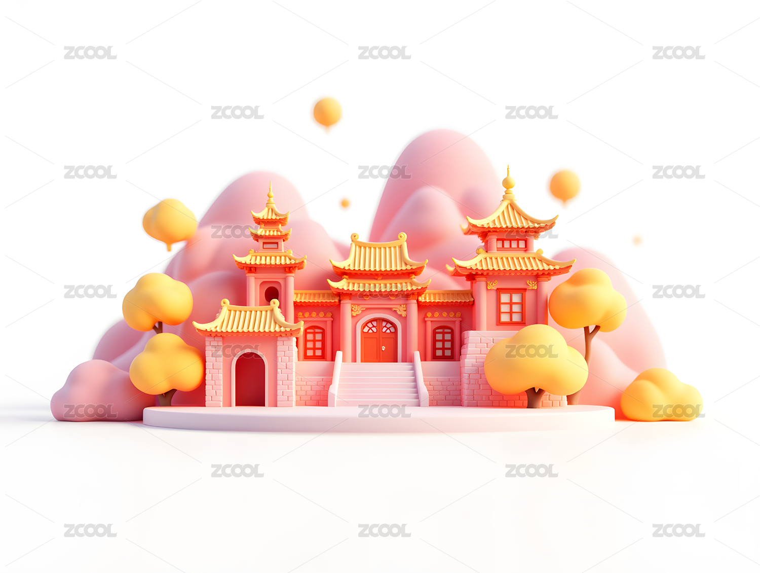 3D渲染中国风古建筑琉璃材质中式阁楼元素