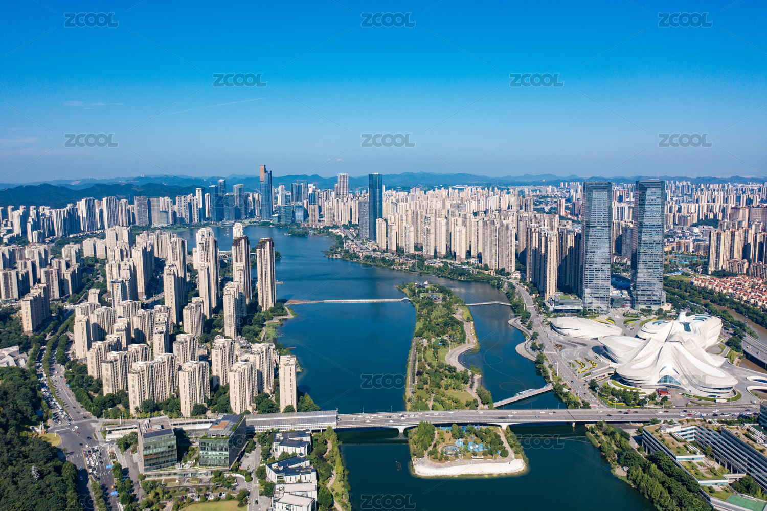 梅溪湖,长沙,城市,航拍,玻璃幕墙,高楼,房地产,梅溪湖城市岛,水面,蓝天