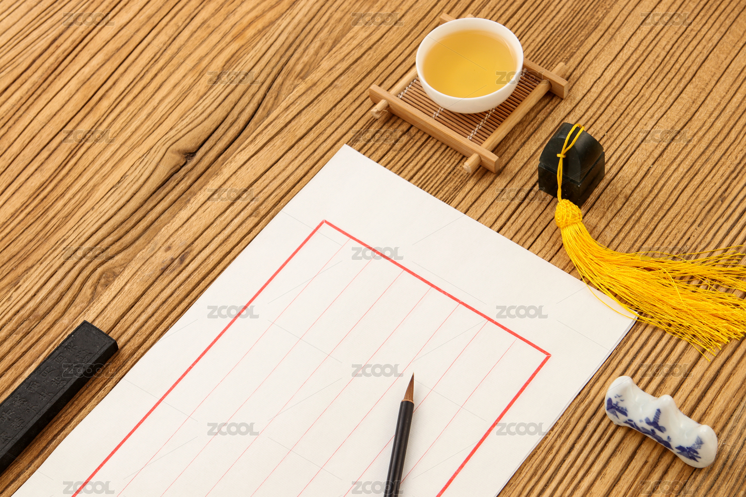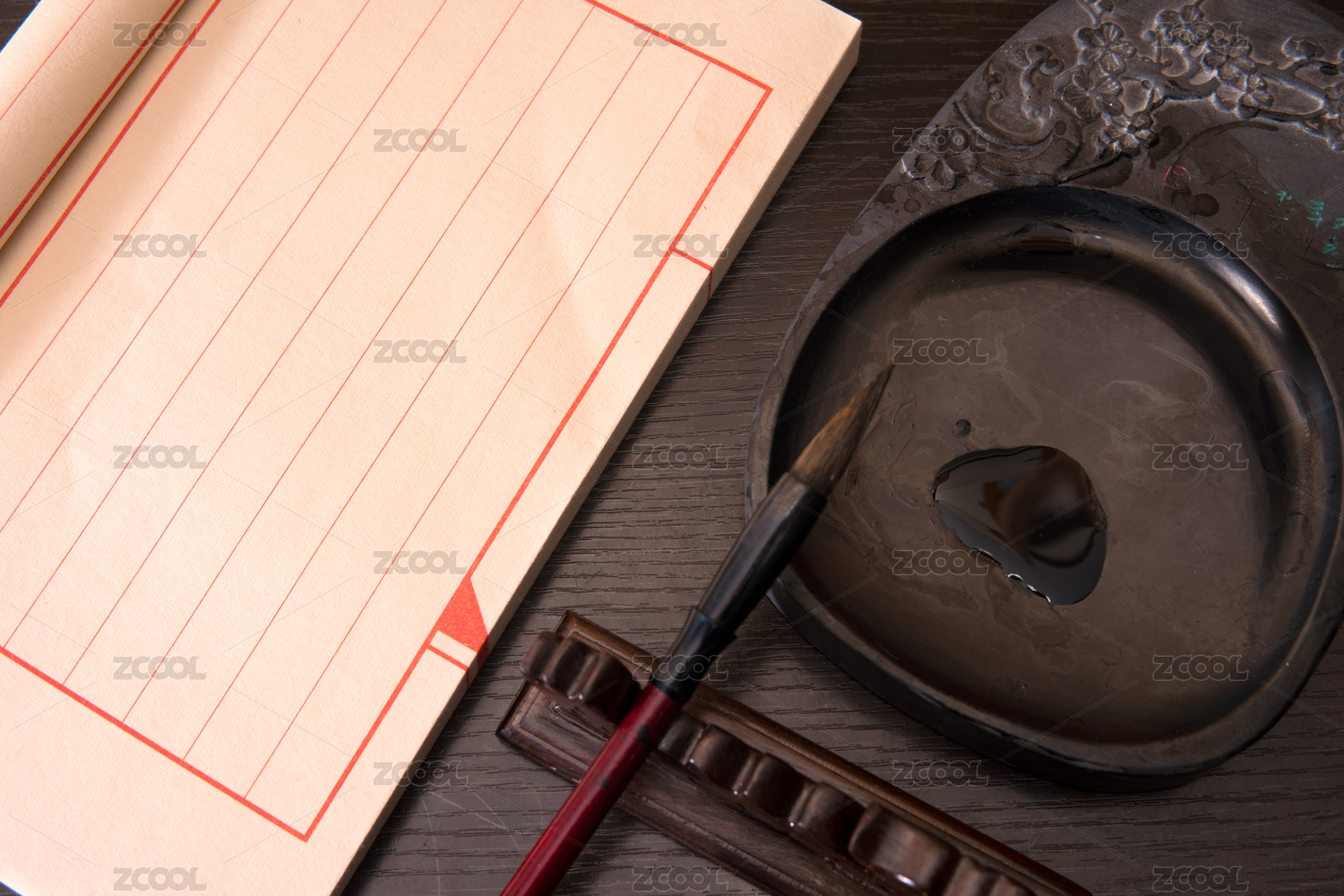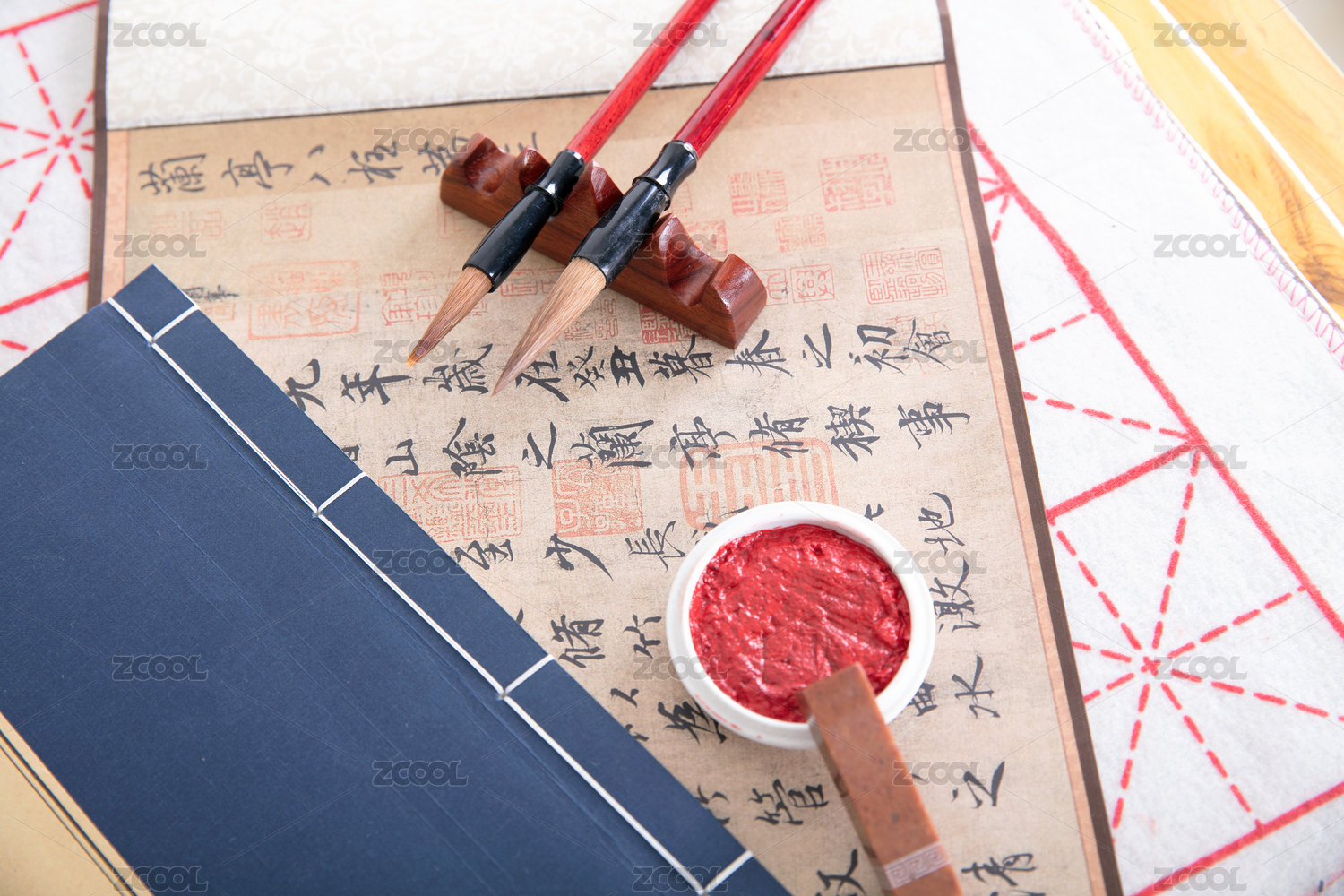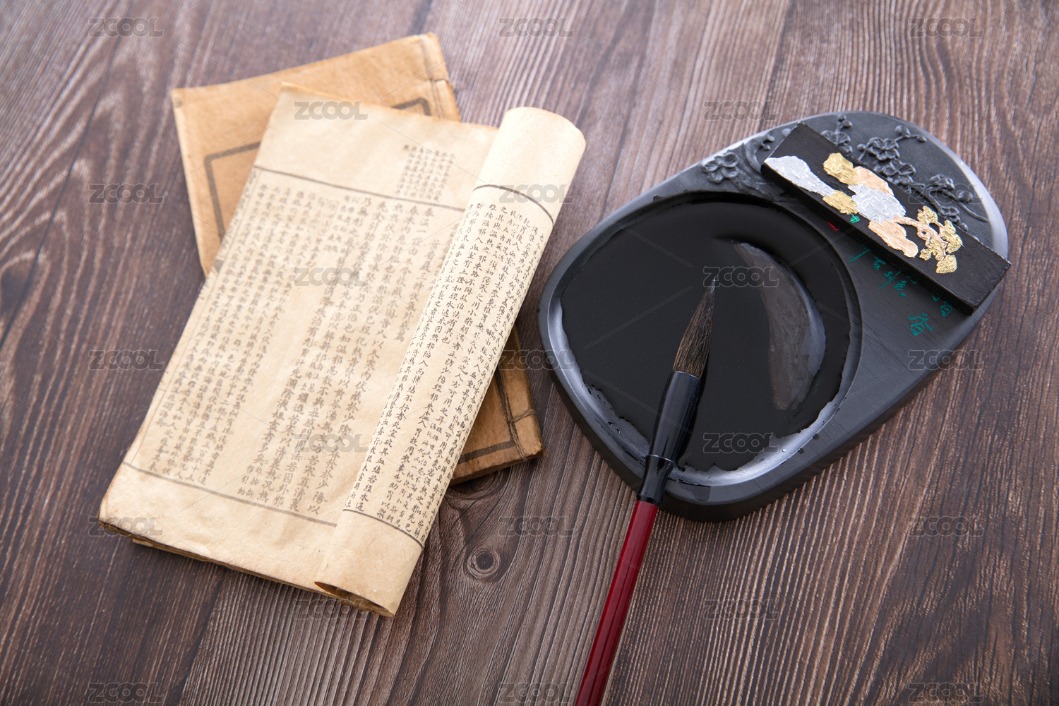 桌子上摊开的书法作品和毛笔砚台等相关物品