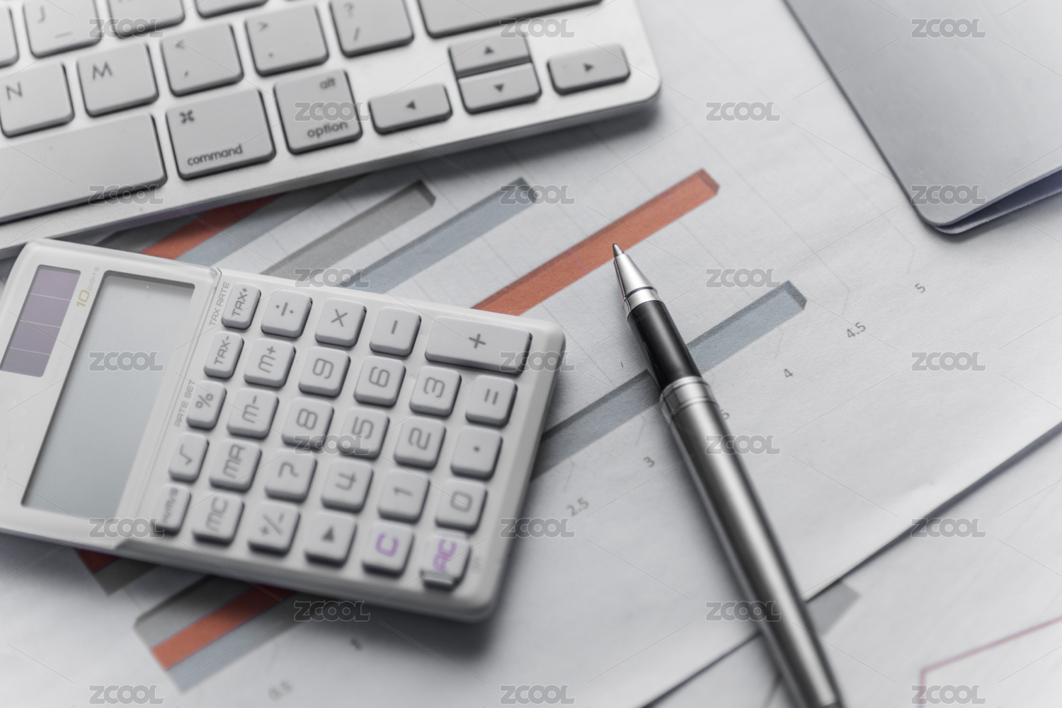 俯视拍摄金融材料上的计算器和算盘及放大镜和签字笔
