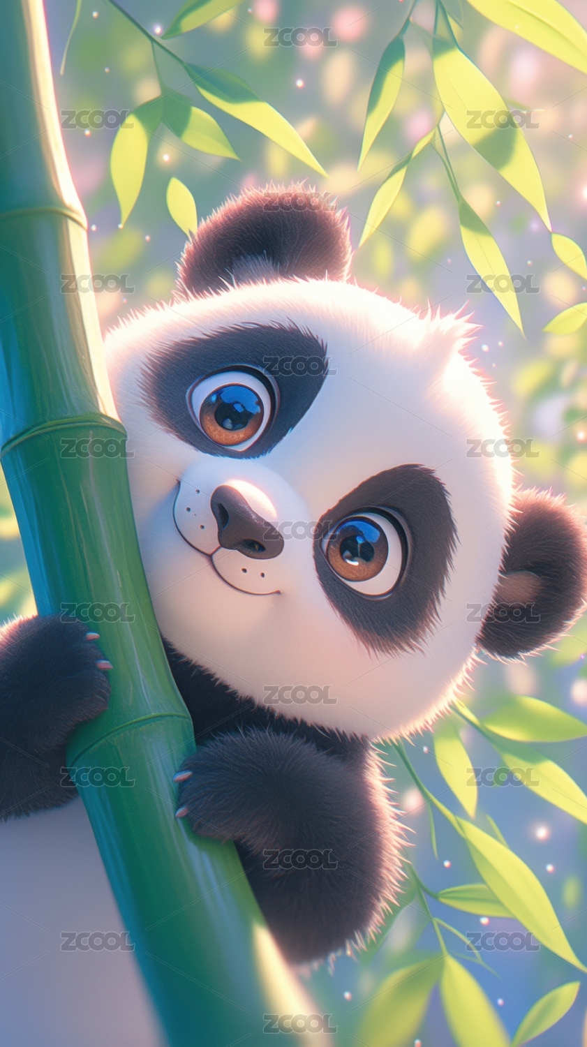 竹林阳光下3D可爱熊猫插画