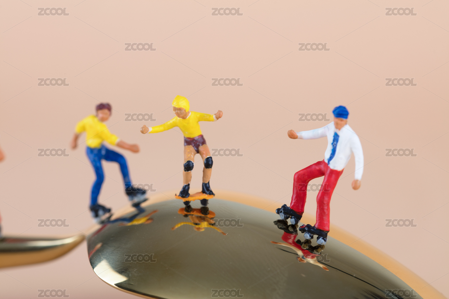 餐具上滑旱冰的微缩运动者