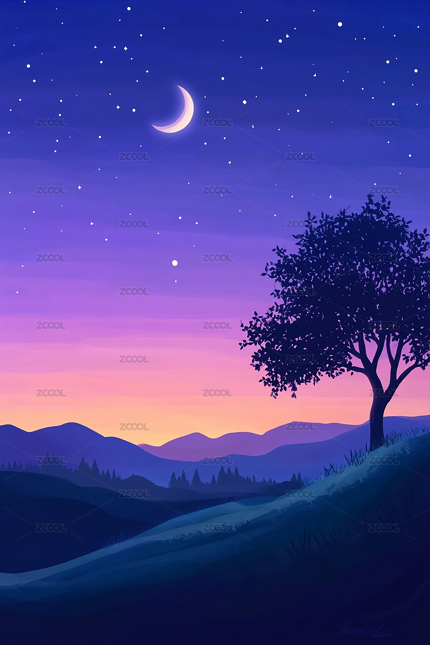 星空树木手绘插画