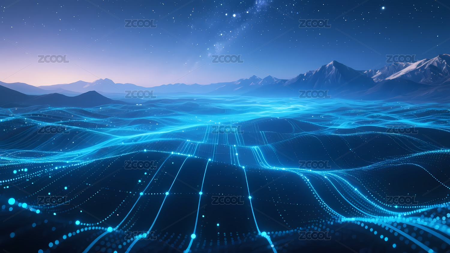 蓝色能量脉络蜿蜒流淌于数字山脉