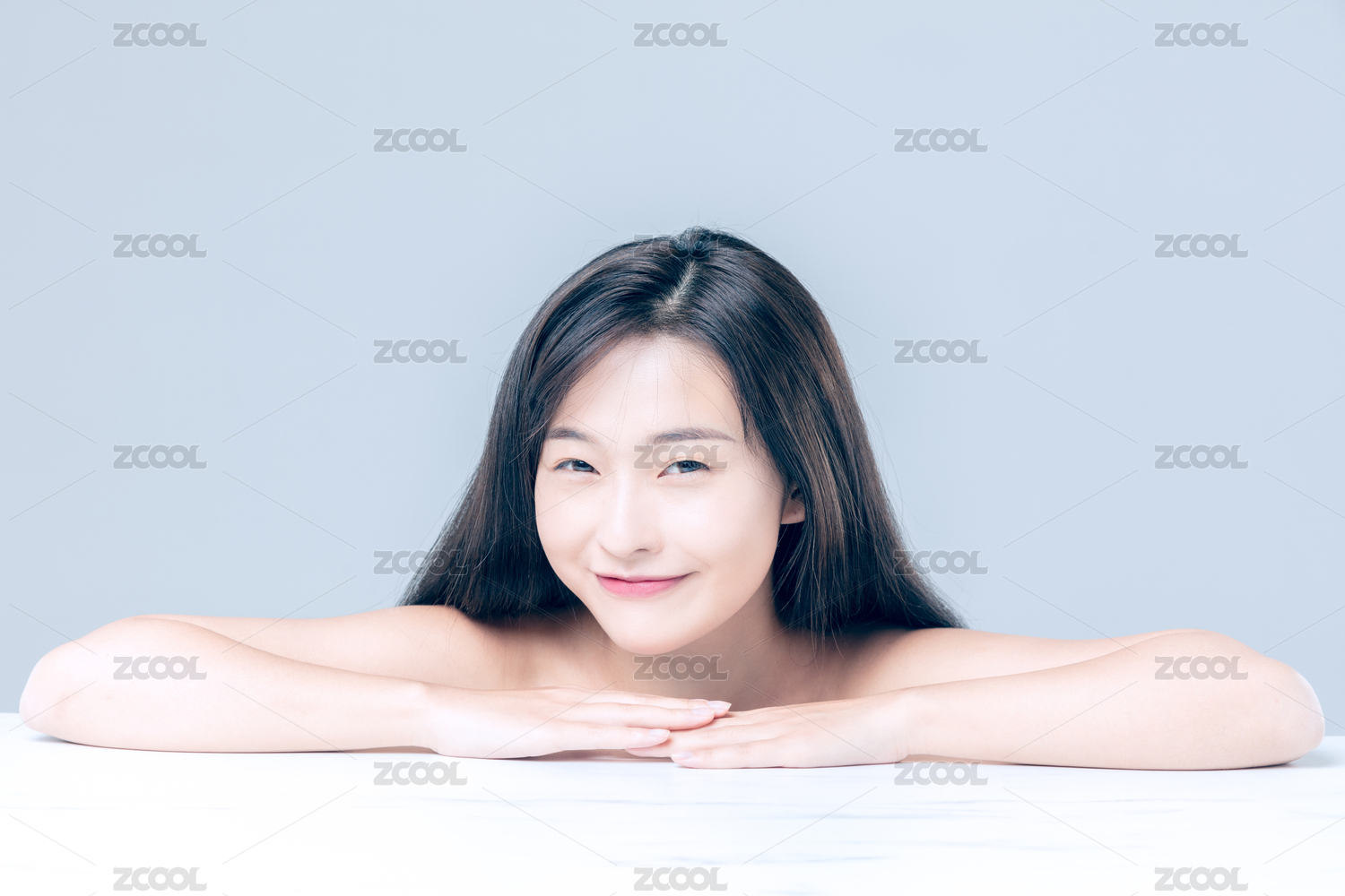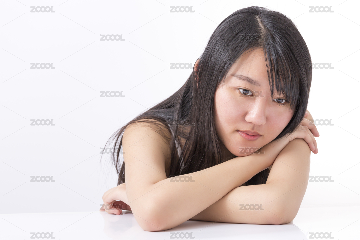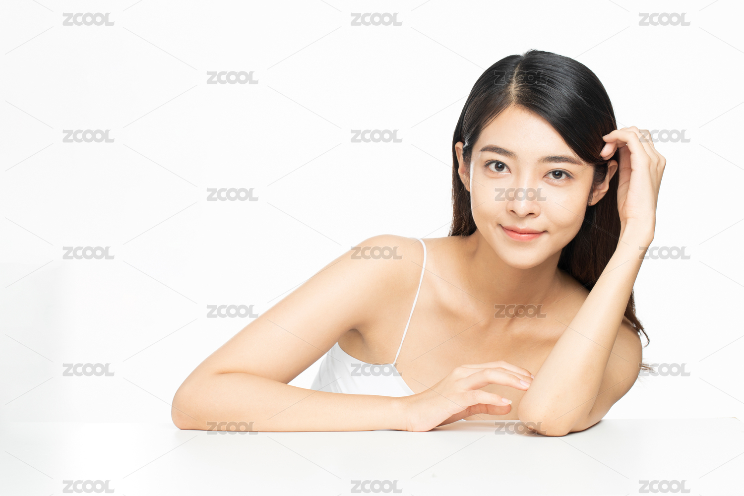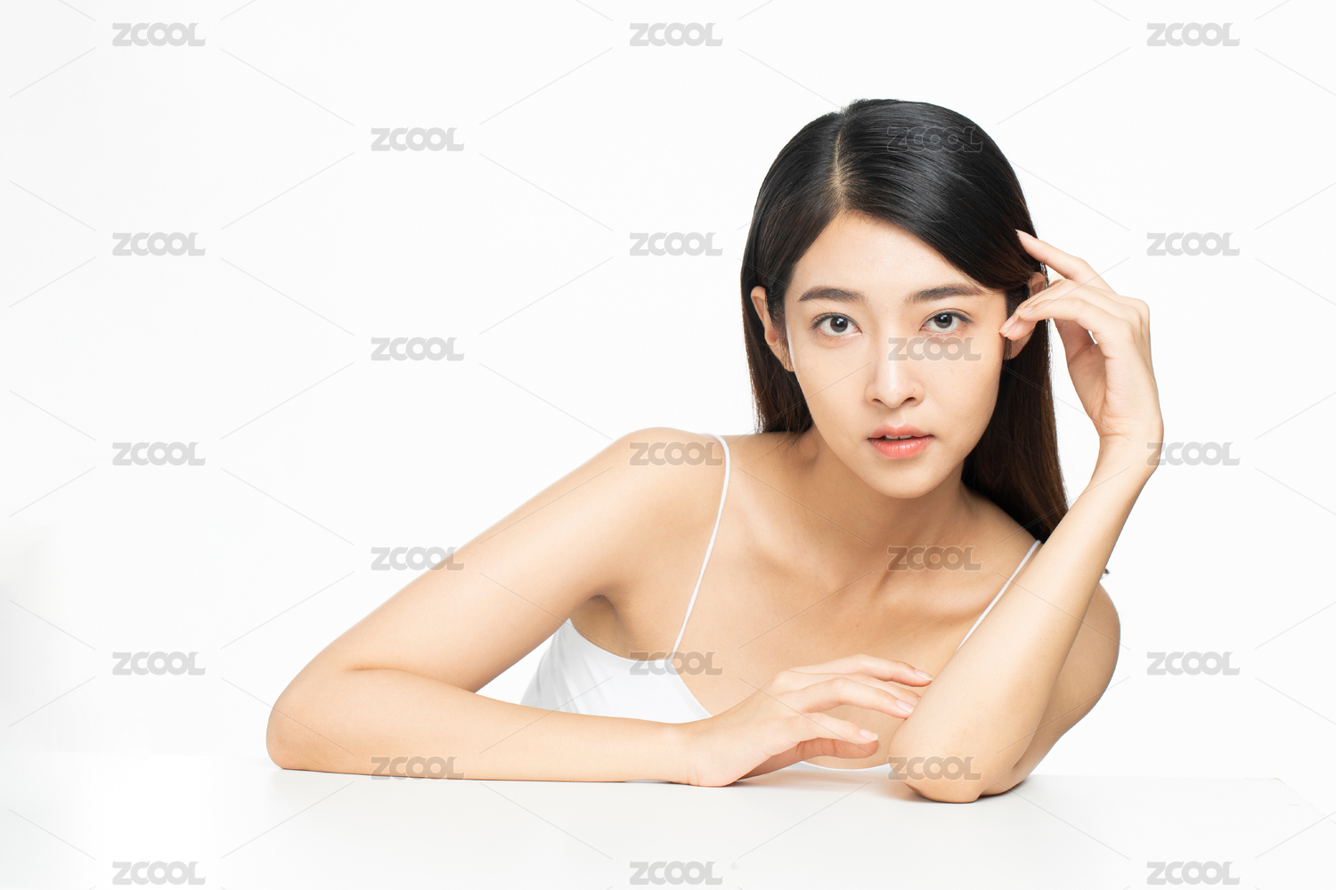 一位美丽的亚裔女孩站在纯色背景墙前用手背轻抚脸颊
