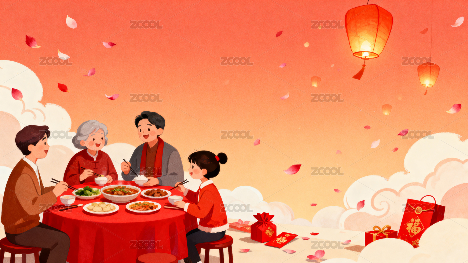 春节团圆聚餐插画一家人年夜饭过年活动海报