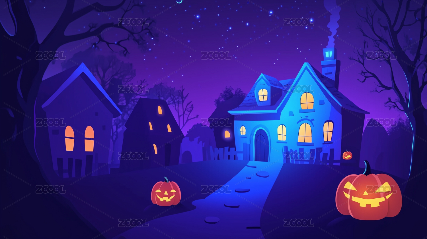 欢乐万圣节幽灵南瓜灯鬼怪城堡节日插画