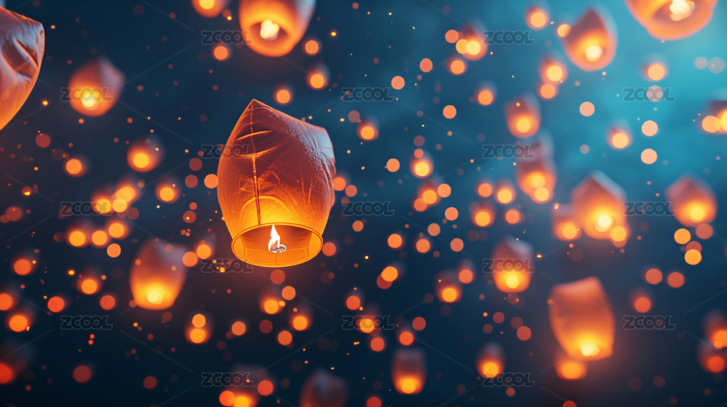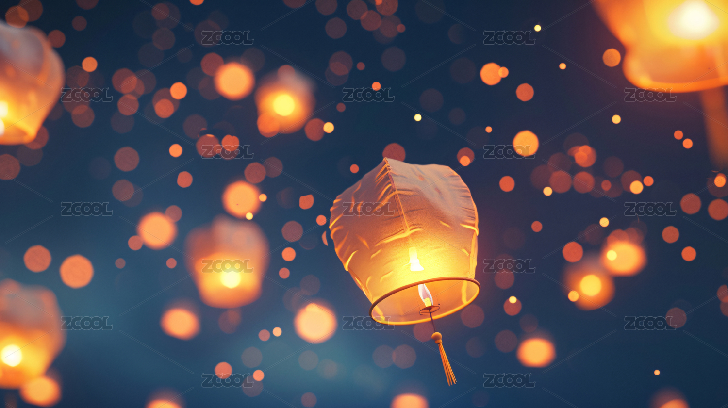 中秋节孔明灯元宵节灯笼思念团圆概念插画