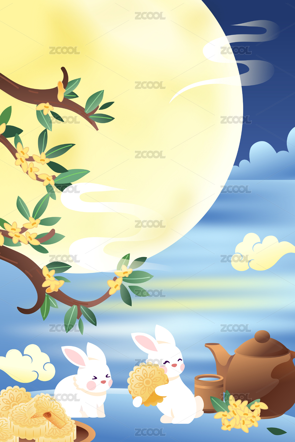国风中秋节月亮月兔桂花月饼矢量插画
