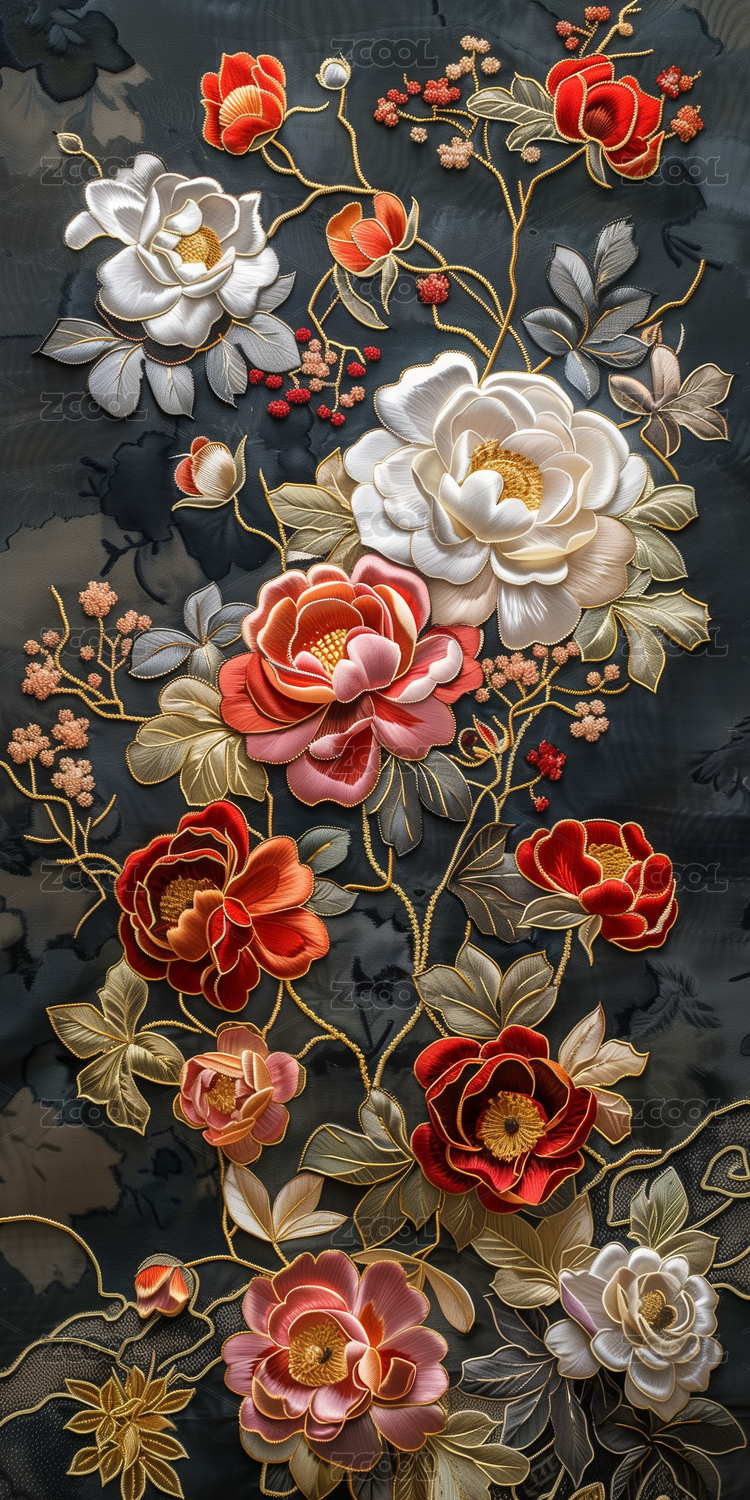 刺绣传统金线奢华牡丹花卉丝绸图案