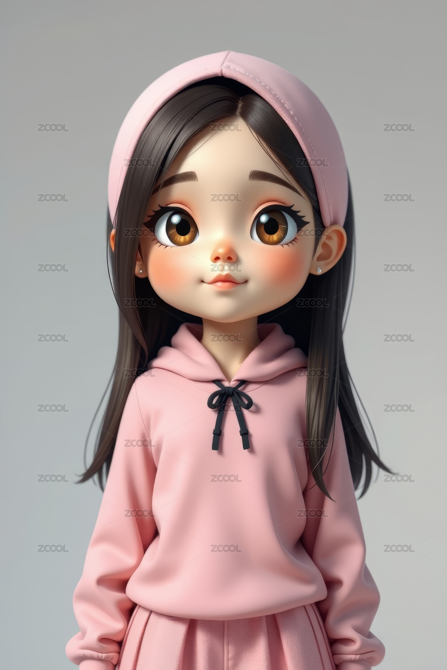 一个穿着粉色连帽衫和粉色帽子的娃娃特写高