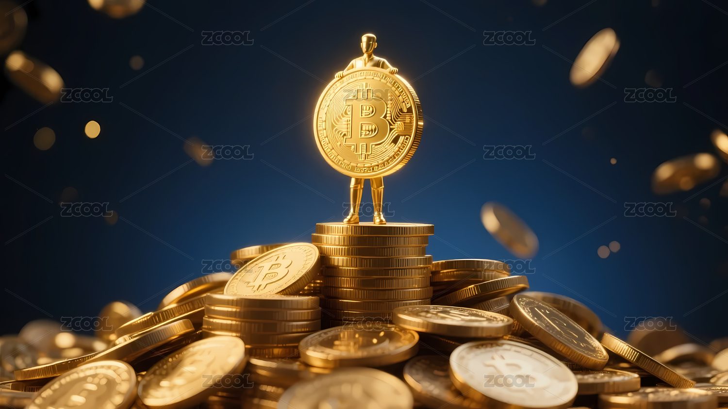 一堆金色的硬币和胶卷背景是模糊的金色光斑