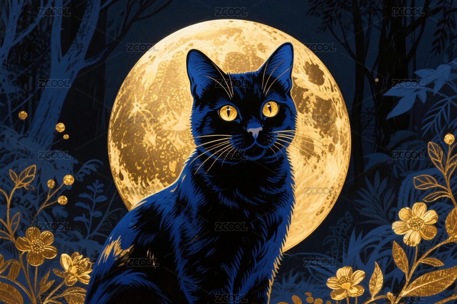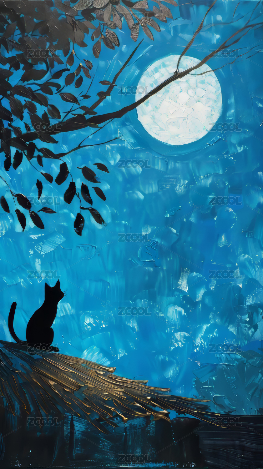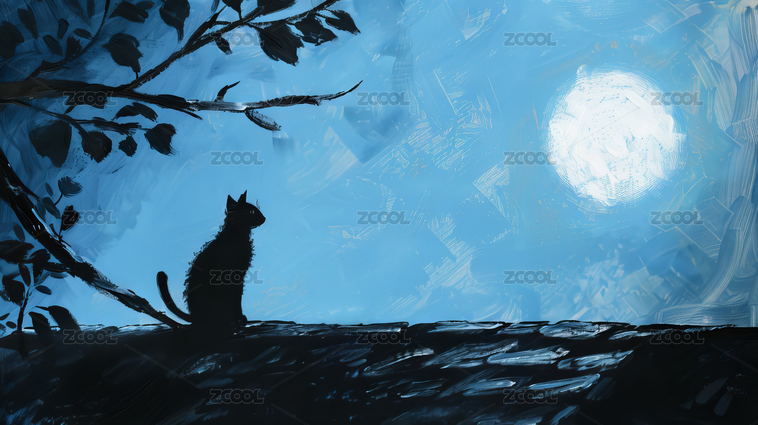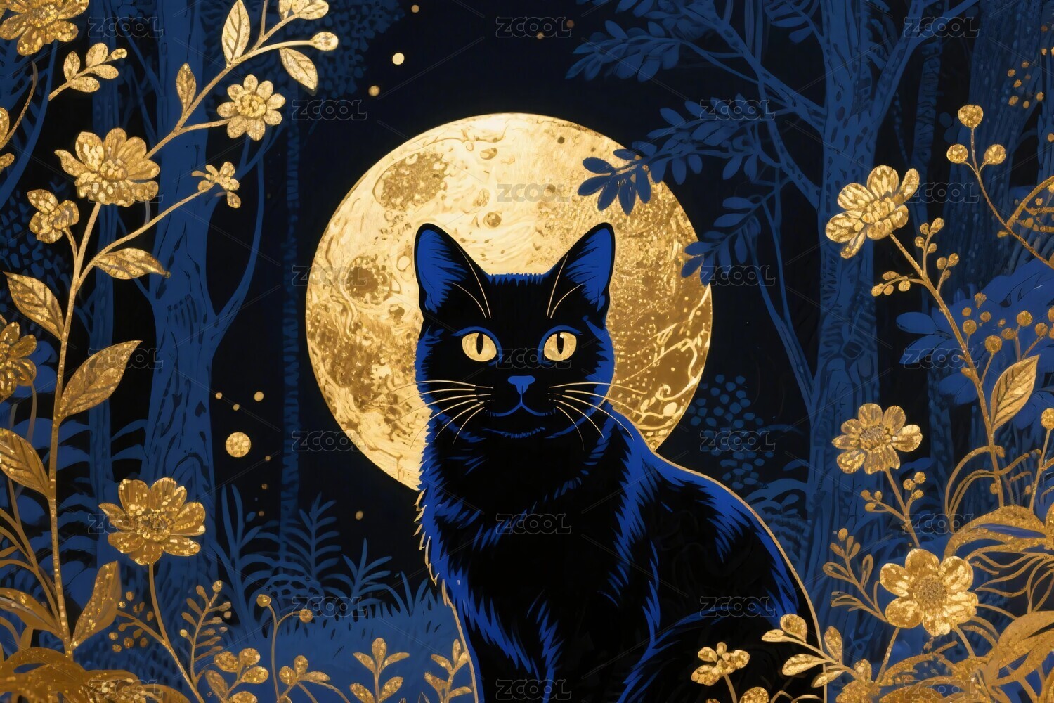 蓝金,插画,动物,细致,金箔,金色,月亮,情绪,壁纸,背景