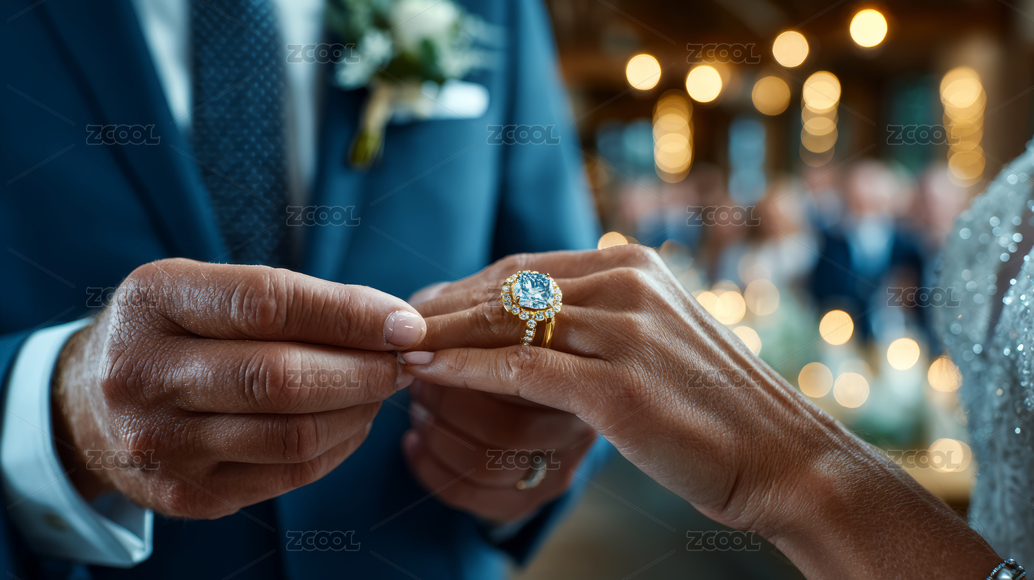 婚礼现场,新郎为新娘戴上婚戒的那一刻