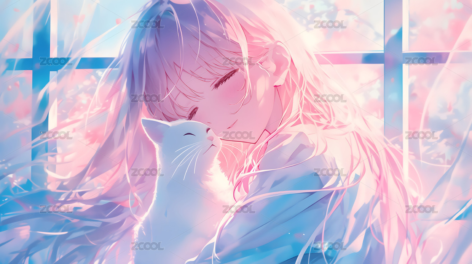 动漫风格少女抱着小猫
