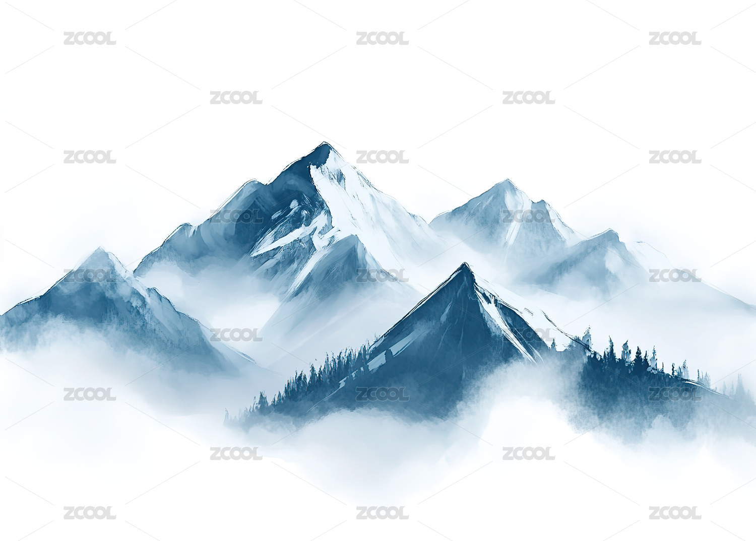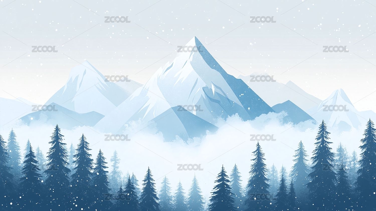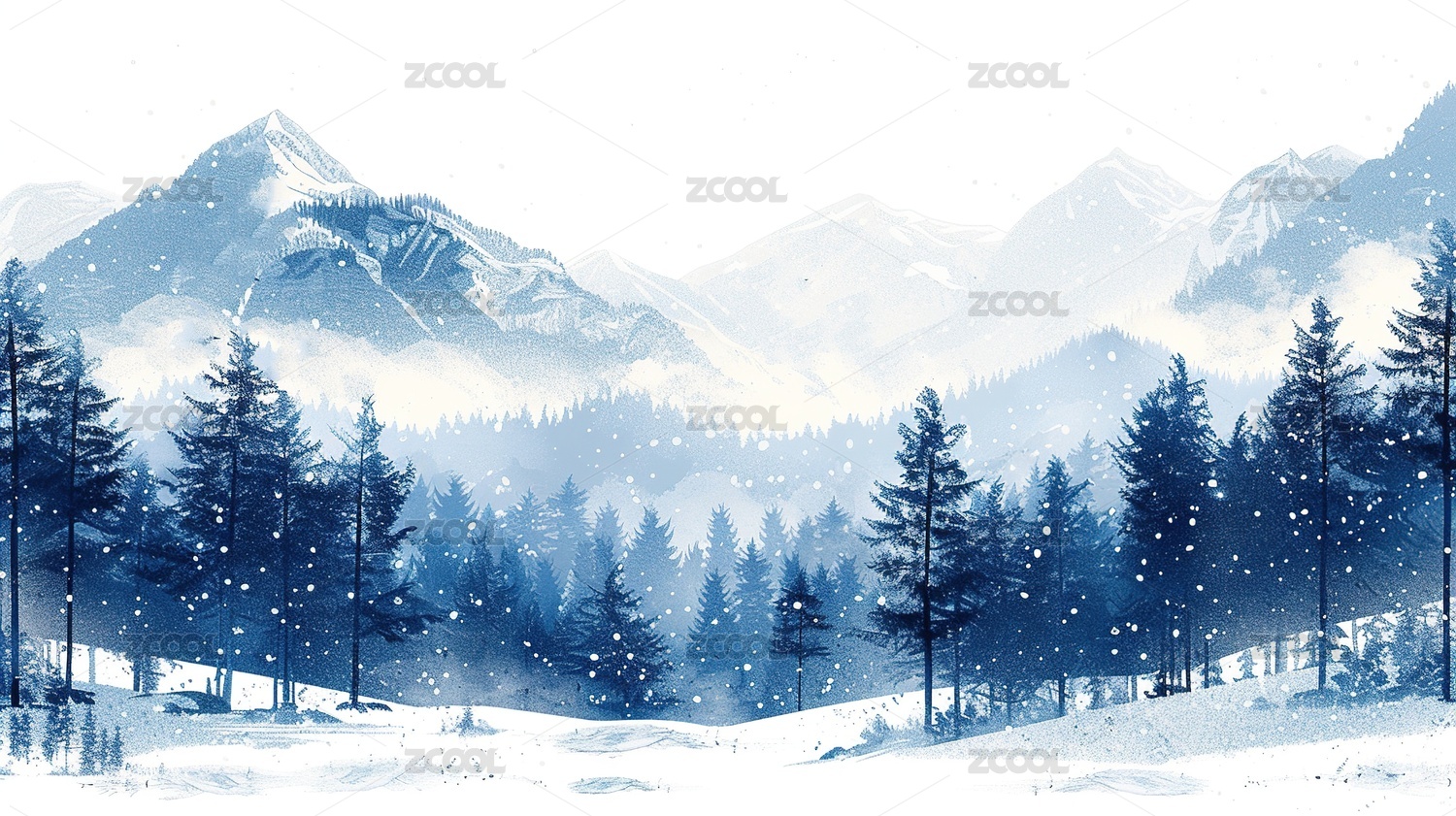 水墨风格雪山松林冬日美景