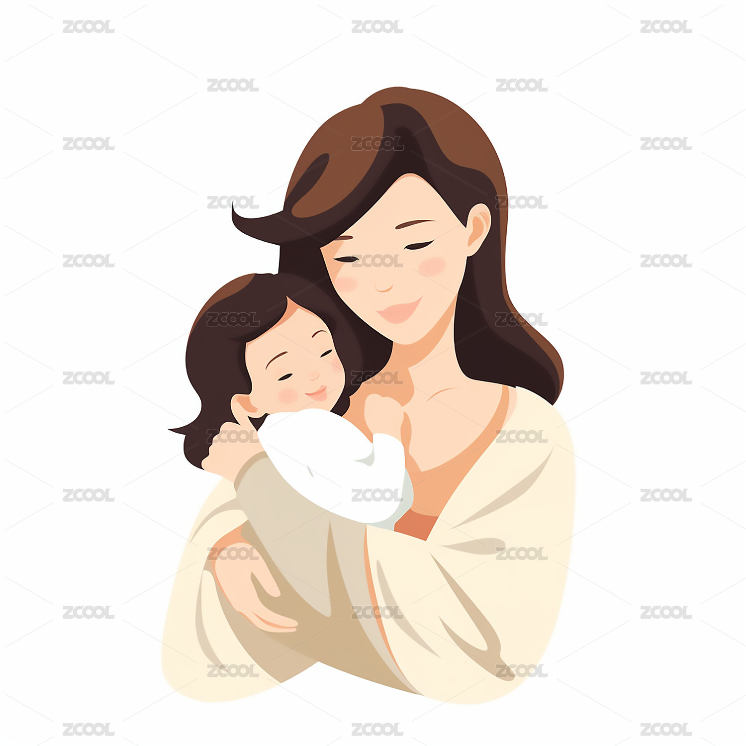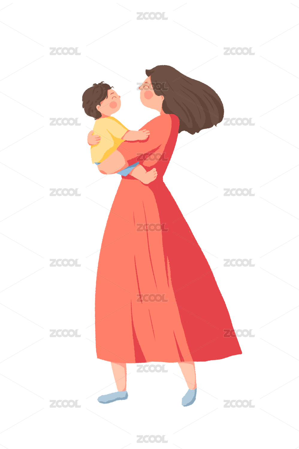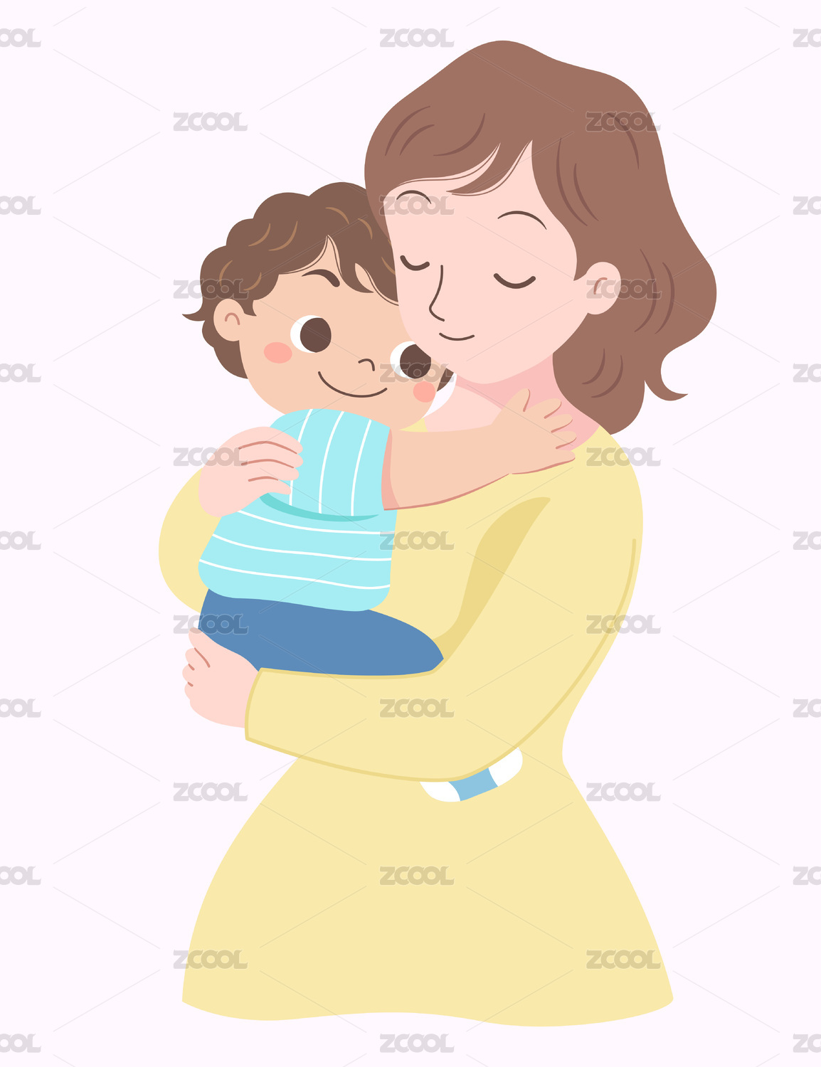 母与子婴儿妈妈拥抱免扣手绘卡通矢量图