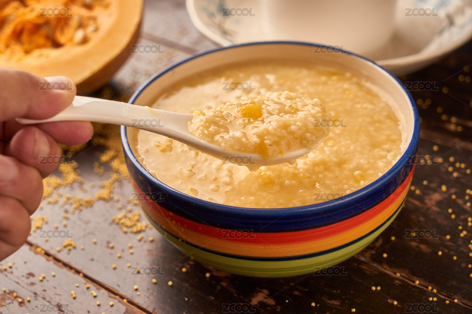 盛着小米南瓜粥的彩色瓷碗放在木桌上