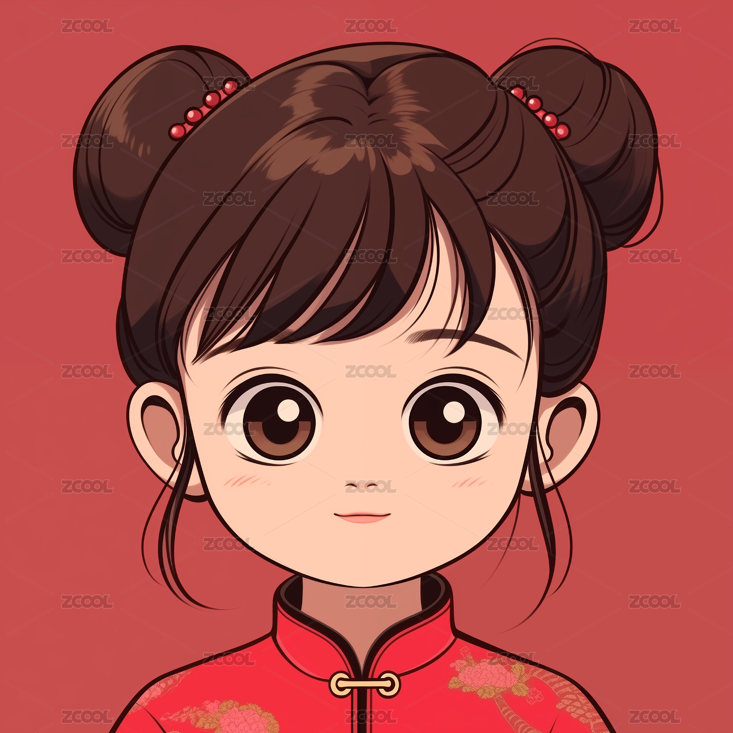 手绘卡通可爱的穿着红色唐装的女孩插画