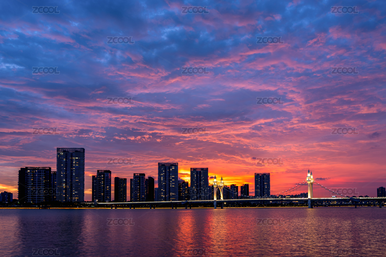 日落后晚霞映照下的珠海市白石桥景观