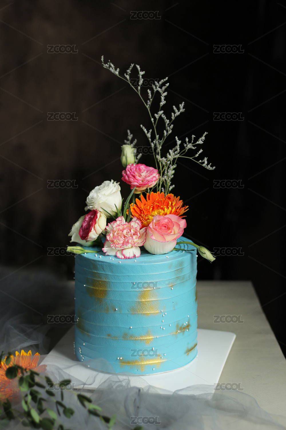 放在蛋糕托盘上的蓝色鲜花蛋糕
