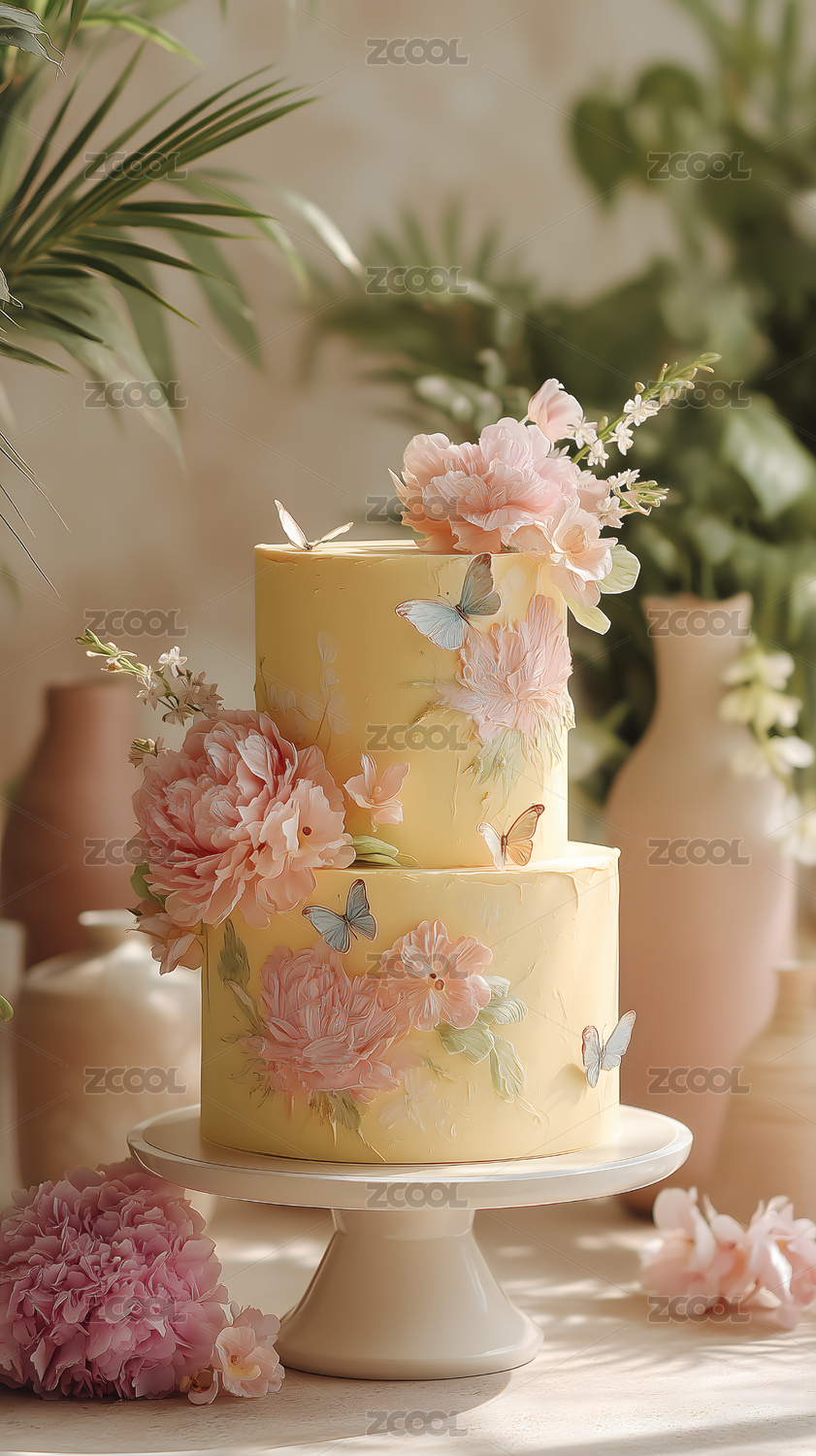 放在蛋糕托盘上的两层森系鲜花奶油蛋糕