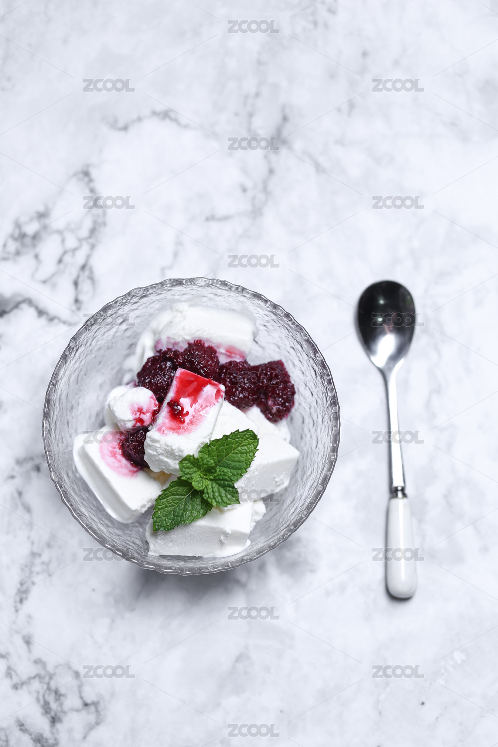 大理石桌上的蓝莓和蓝莓味冰激凌