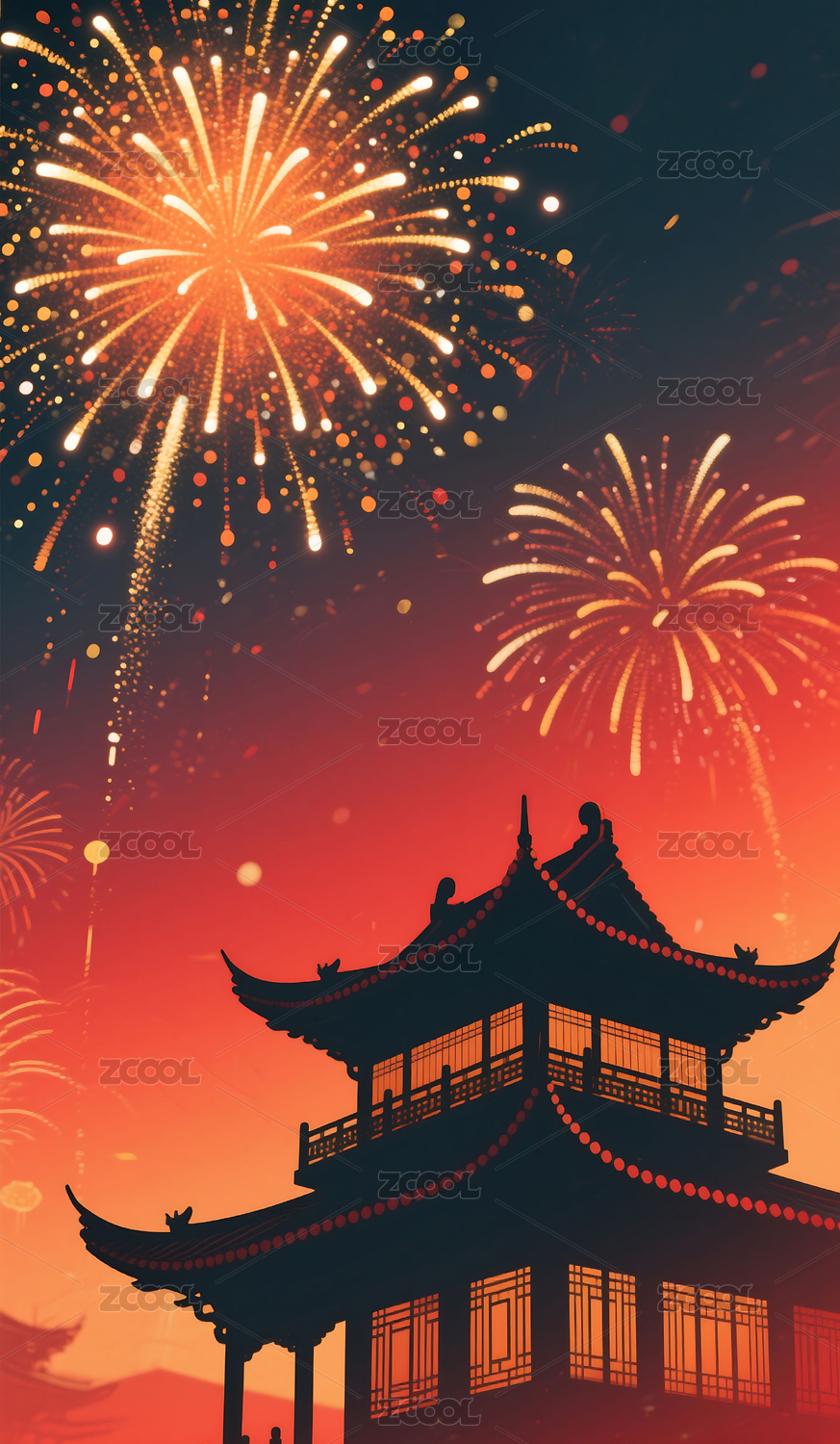 中式传统春节过年烟花古建筑插画背景壁纸