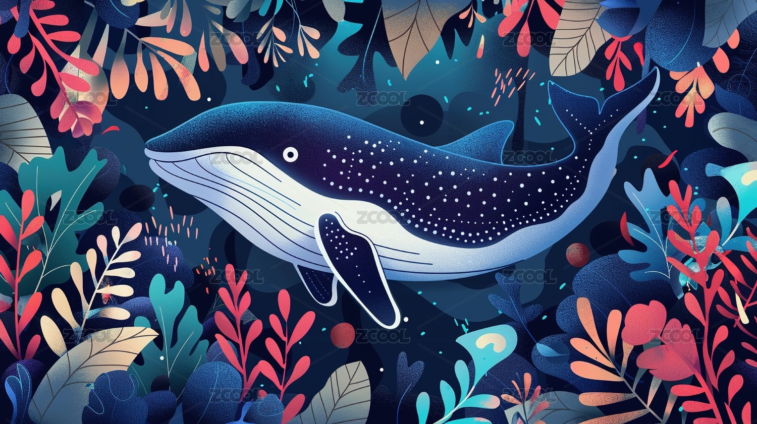 花中童话鲸鱼卡通插画
