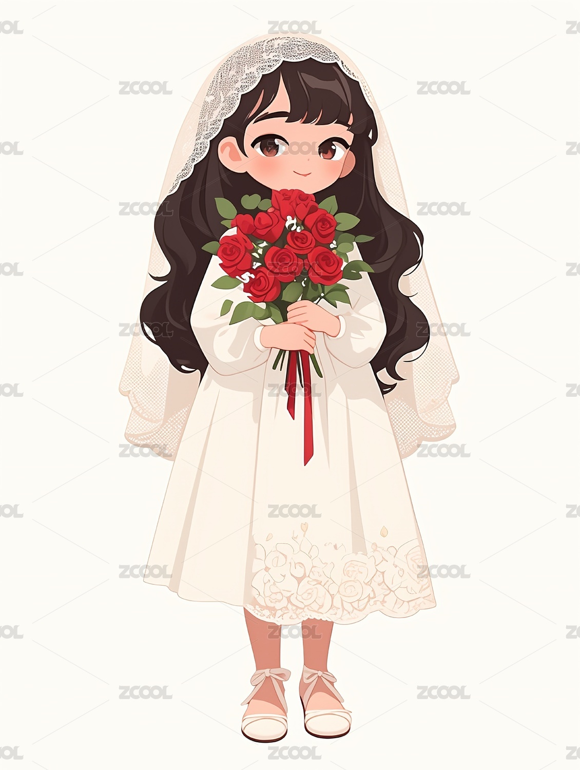 女人,插画,花,可爱的,花束,连衣裙,庆祝,卡通,玫瑰花,白裙子